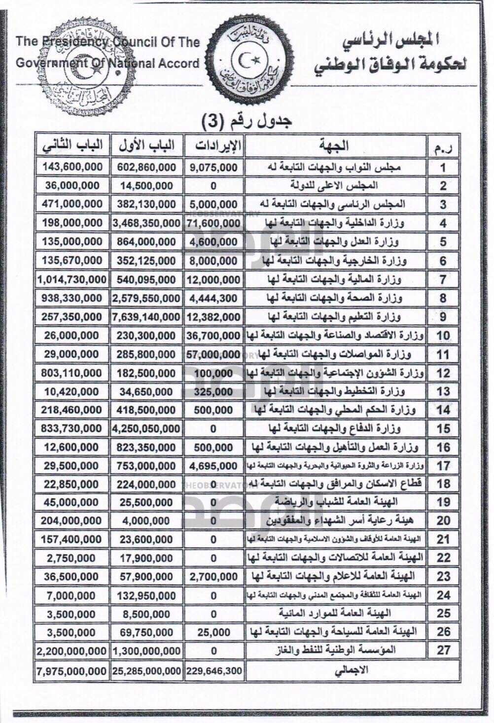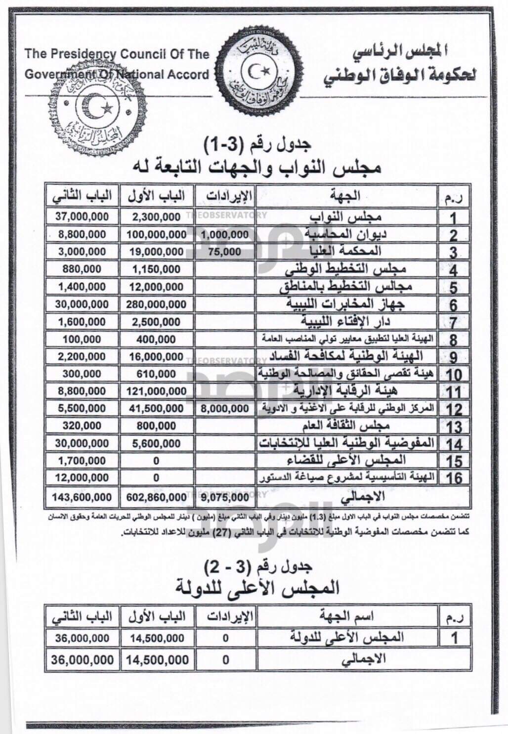 وفي ما يلي تفصيل الجزء الأول من الميزانية المتعلق بالمخصصات المخصصة لمجالس النواب والرئاسي والدولة وديوان رئاسة الوزراء بإجمالي 166.8 مليون دينار ليبي تضاف لها ميزانيات الجهات التابعة لهما بإجمالي 1 مليار و 47.2 مليون دينار ليبي :