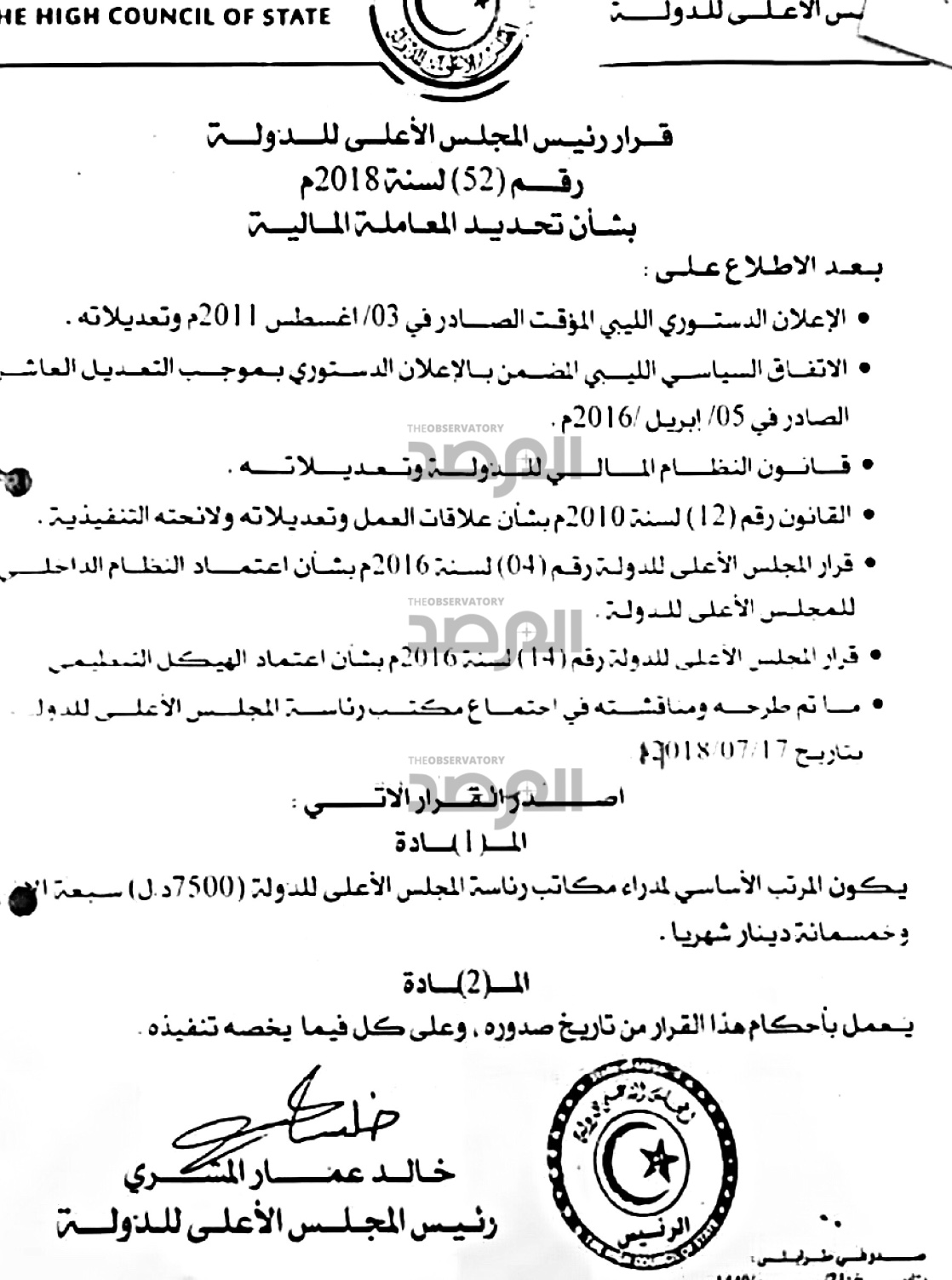 وقد نص القرار المسرب مؤخراً ذي الرقم 52 لسنة 2018 وتلقت المرصد نسخة منه على تحديد مبلغ 7500 دينار شهري كمرتب أساسي من غير العلاوات والمكافآت المحتملة لمدراء مكاتب رئاسة مجلس الدولة .