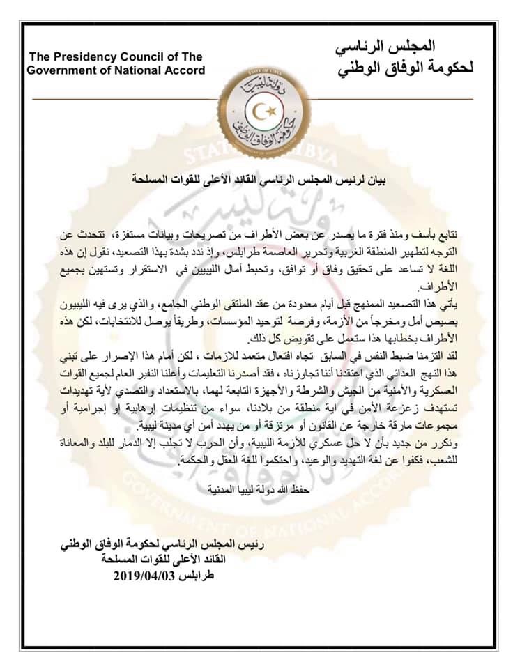 واختتم السراج بيانه بالتأكيد على أنه لا حل عسكري للأزمة الليبية، وأن الحرب لا تجلب إلا الدمار للبلد والمعاناة للشعب، داعياً الى الكف عن لغة التهديد والوعيد، والاحتكام للغة العقل والحكمة.