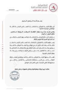 اللجنة المركزية لفتت في بيان صادر عنها تلقت المرصد نسخة منه إلى أنها قامت بنشر أسماء الفائزين عبر مواقعها المختلفة بشبكة الإنترنت لغرض إستلام الطعون والاعتراضات الانتخابية من قبل اللجان الفرعية خلال يومين من مدة نشرها.