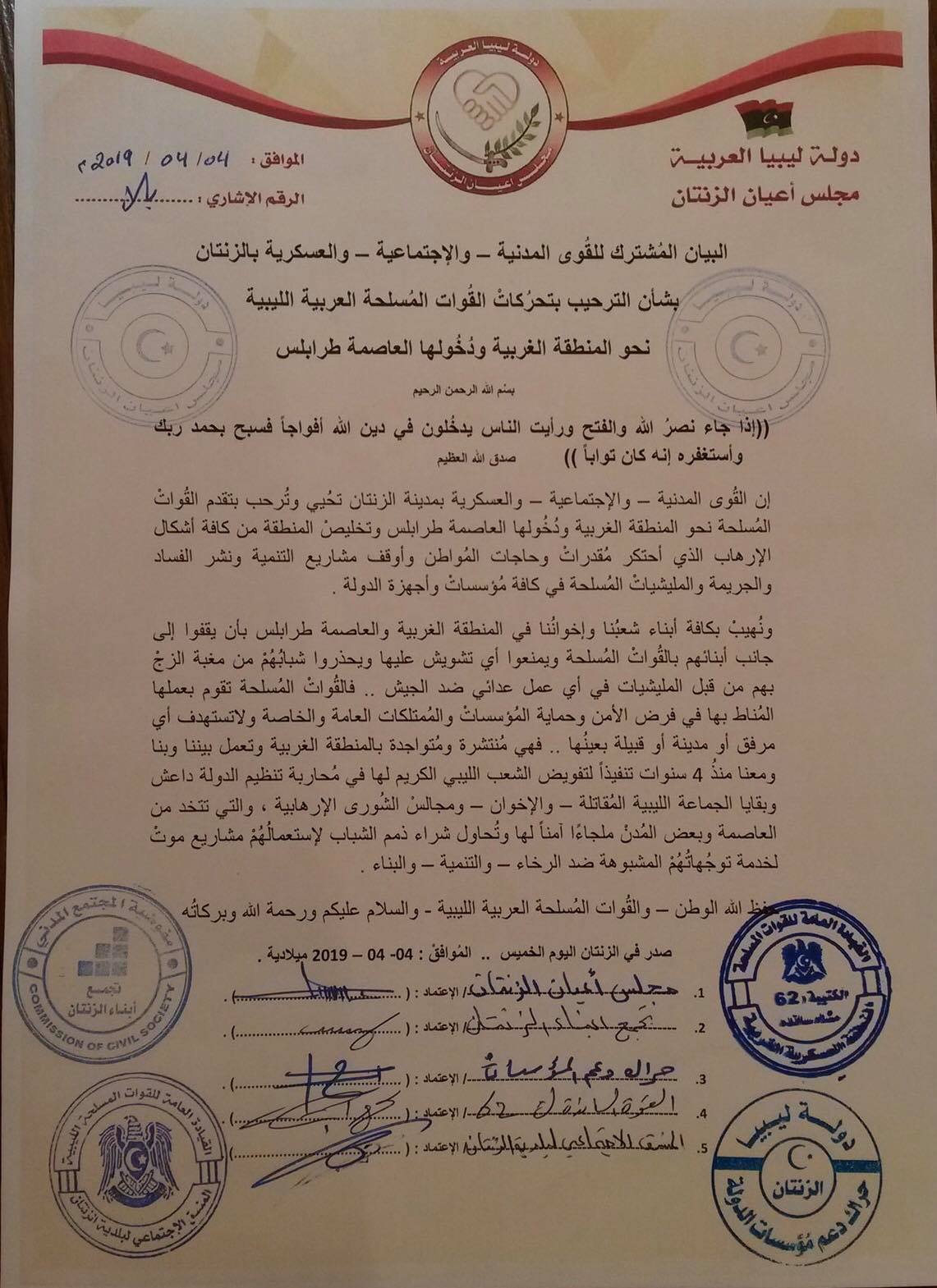 ليبيا – أصدرت القوى المدنية والاجتماعية والعسكرية في مدينة الزنتان اليوم الجمعة بياناً بشأن الترحيب بتحركات القوات المسلحة نحو المنطقة الغربية ودخولها العاصمة طرابلس.