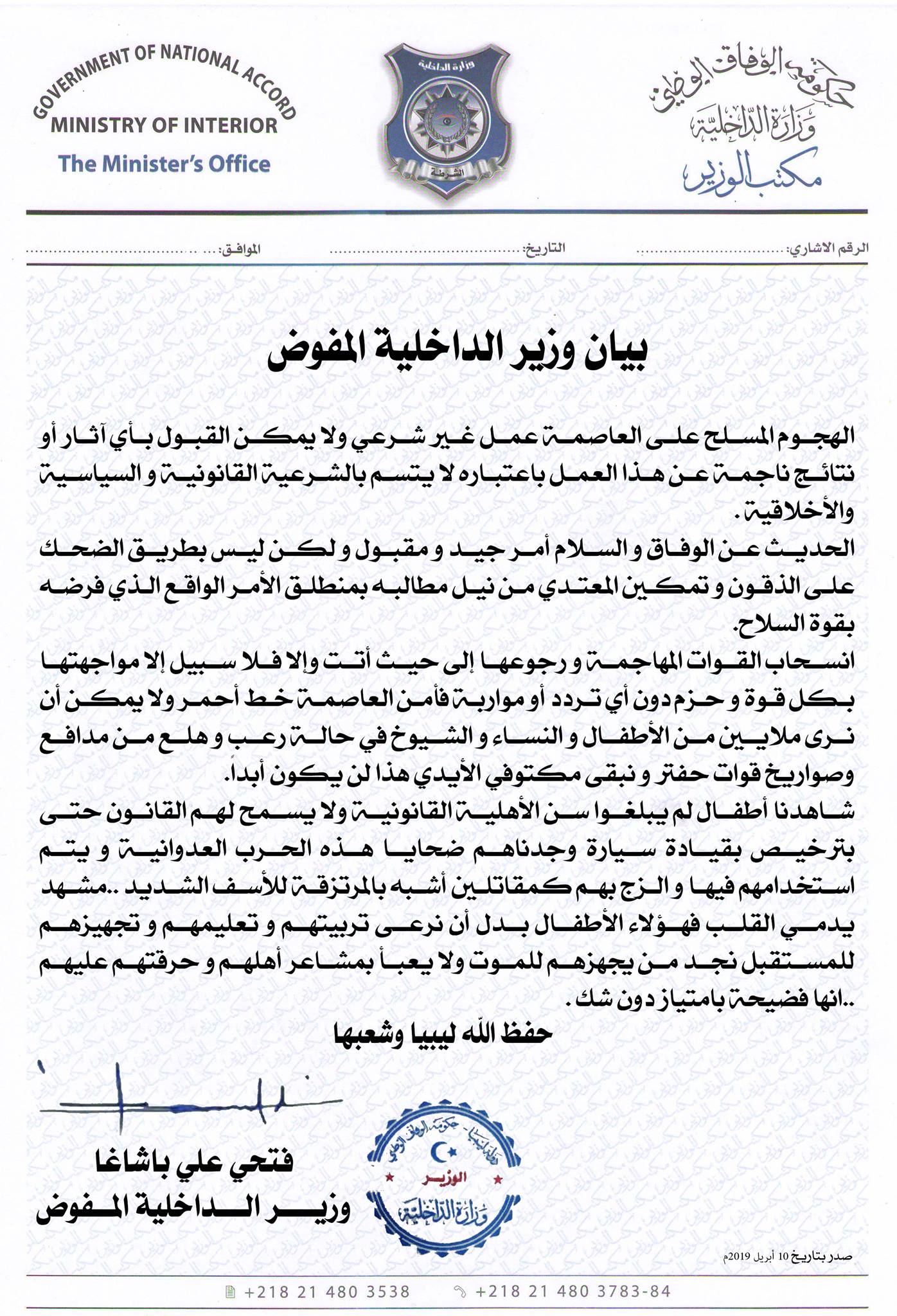 ليبيا – إعتبر عضو مجلس النواب المقاطع ووزير داخلية الوفاق فتحي باشاآغا في بيان له اليوم الاربعاء بانما وصفه بـ” الهجوم المسلح ” (تقدم القوات المسلحة إلى العاصمة) عمل غير شرعي ، مبيناً بأنهم لن يقبلوا بأي آثار أو نتائج ناجمة عن هذا العمل باعتباره لا يتسم بالشرعية القانونية والسياسية والأخلاقية على حد زعمه.