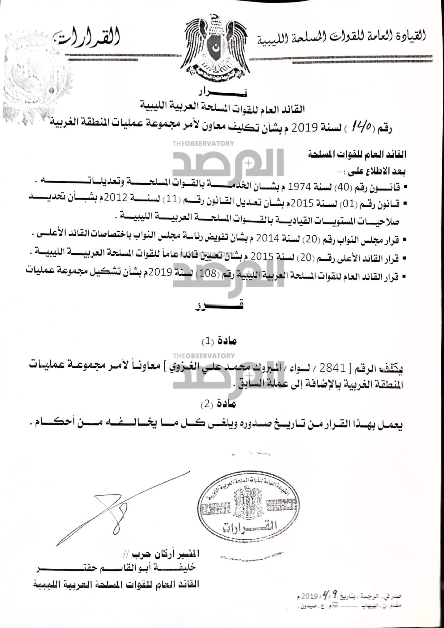 ونص القرار الذي تحصلت المرصد على نسخة منه على تكليف اللواء المبروك الغزوي معاوناً لآمر مجموعة عمليات المنطقة الغربية اللواء عبدالسلام الحاسي بالإضافة إلى سابق عمله المكلف به .