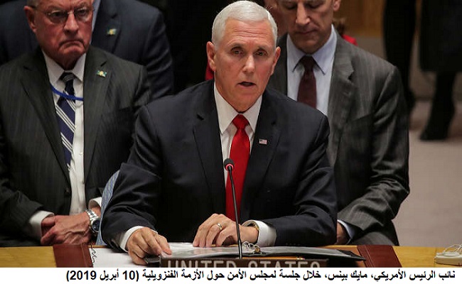 وقال بينس، في كلمة ألقاها خلال الجلسة المنعقدة امس بمبادرة من الولايات المتحدة: “حان الوقت لتعترف الأمم المتحدة بالرئيس الانتقالي خوان غوايدو رئيسا شرعيا لفنزويلا ولتمنح مقعدا في هذا الهيكل لمن يمثله، بينما يجب سحب صلاحيات مندوب فنزويلا الحالي”.