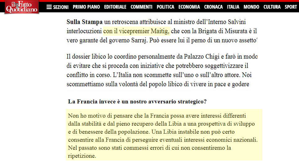 وفي مقابلة مع صحيفة Il Fatto Quotidiano ترجمتها وتابعتها صحيفة المرصد قلل كونتي من أهمية الحوار المنشور يوم أمس الجمعة بصحيفة La Stampa والذي تطرق إلى حديث سالفيني مع عضو الرئاسي أحمد معيتيق إدعى بعده الوزير الإيطالي أن فرنسا تحاول تقويض حكومة الوفاق مما دفعه لمهاجمة باريس بقوة .