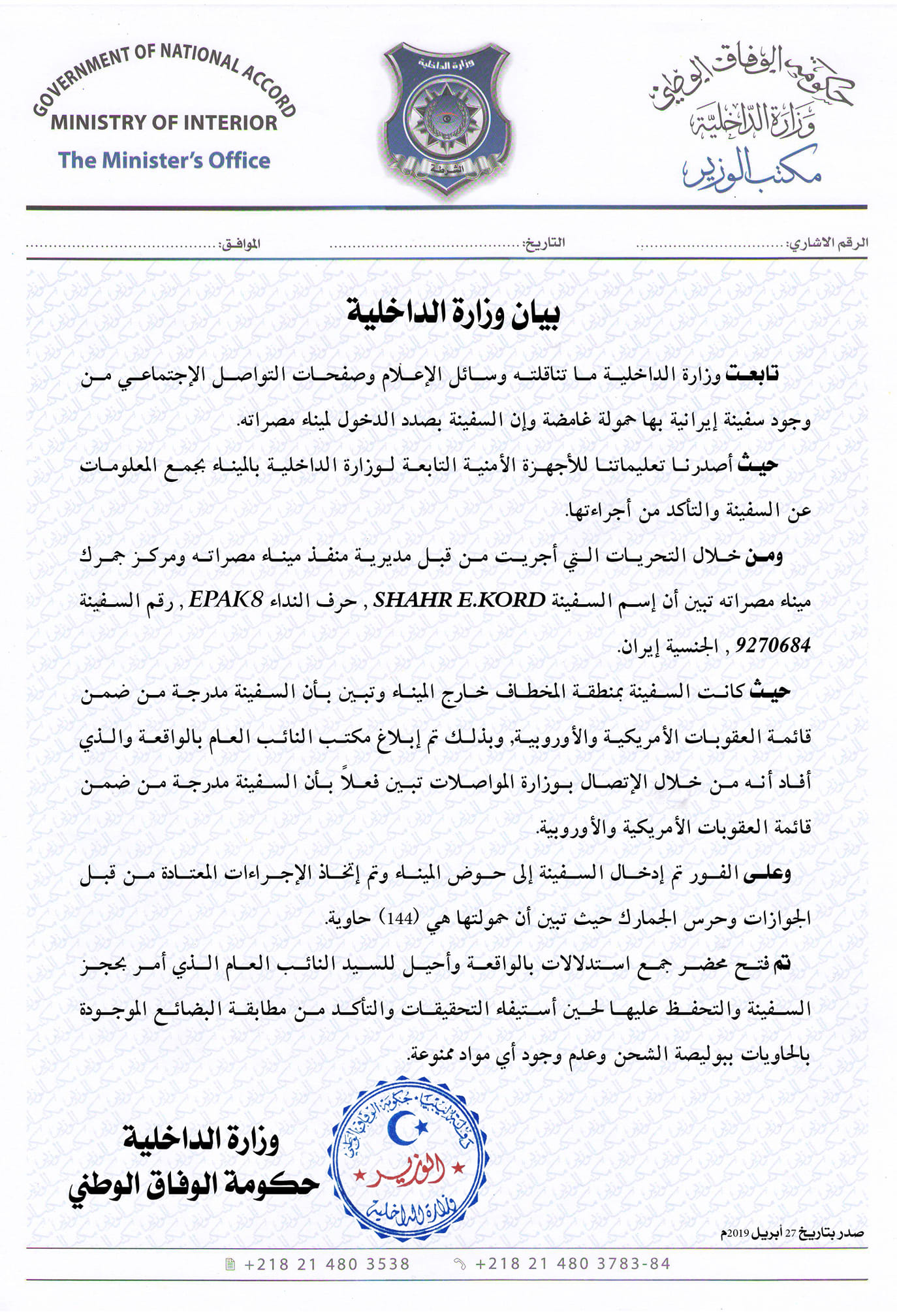ليبيا – تأكيداً لما انفردت به صحيفة المرصد يوم الثلاثاء الماضي أصدر عضو مجلس النواب المقاطع ووزير داخلية الوفاق فتحي باشاغا بياناً بشأن السفينة الايرانية المدرجة على قائمة العقوبات الامريكية والأوروبية لإرتباطها بالحرس الثوري الإيراني بعد دخولها ميناء مصراتة وذلك بناءً على تعلميات من النائب العام .