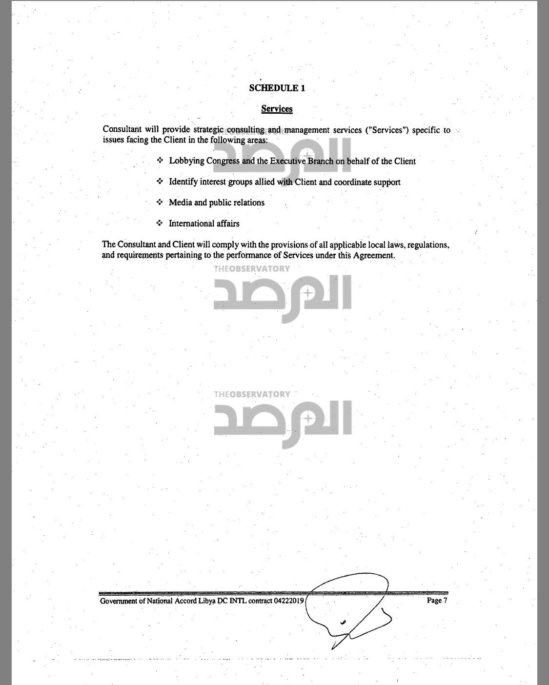 من جهته أكد موقع ” المونيتور ” الأمريكي الإخباري المتخصص في شؤون الشرق الأوسط توقيع حكومة الوفاق صفقة بقيمة مليوني دولار مع شركة ” ميركوري للشؤون العامة ” للضغط على الكونغرس وإدارة دونالد ترامب بعد أيام فقط من التقارير التي تفيد بأن الرئيس دعم المشير خليفة حفتر المناوئ لهذه الحكومة وهذا المبلغ الذي أعلن عنه الموقع متطابق تماماً مع المبلغ المدرج في صورة العقد الذي تحصلت المرصد على نسخة منه .
