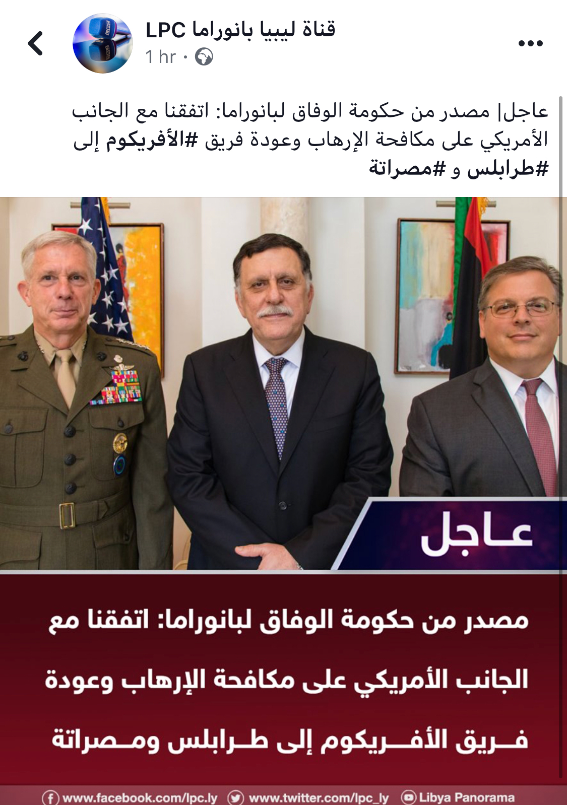 ونقلت كل من شبكة الرائد وقناة ليبيا بانوراما المقربتين من حزب العدالة والبناء عن مصدر مجهول لم تسمه من حكومة الوفاق ما مفاده ( إتفقنا مع الجانب الأمريكي على عودة أفريكوم لقرية جنزور وقاعدة مصراتة الجوية ) مشيرة إلى أن هذا المصدر فضّل عدم إعلان هويته !.