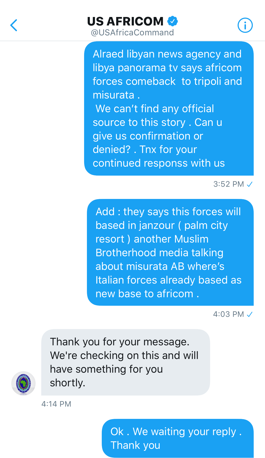 وعلى إثره ، تواصلت صحيفة المرصد الليبية مع المكتب الإعلامي لـ ” أفريكوم ” الذي تشرف عليه مسؤولتهم الإعلامية عبر حسابهم الرسمي الموثق بالعلامة الزرقاء على موقع تويتر وطلب المسؤولون الإعلاميون بعض الوقت للتثبت مما نشر عبر بانوراما والرائد .