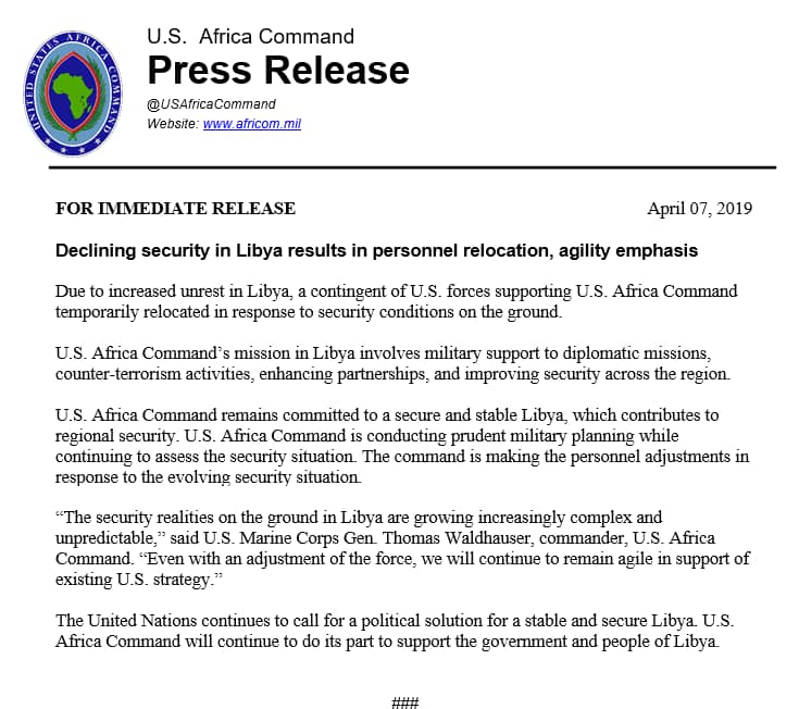 وأعلنت القيادة الأمريكية العسكرية في أفريقيا ” أفريكوم ” في بيان 7 أبريل إجلاء مجموعة من القوات الأمريكية الداعمة لها على الأرض مؤقتًا واستجابة للظروف الأمنية والإضطرابات المتزايدة في طرابلس .