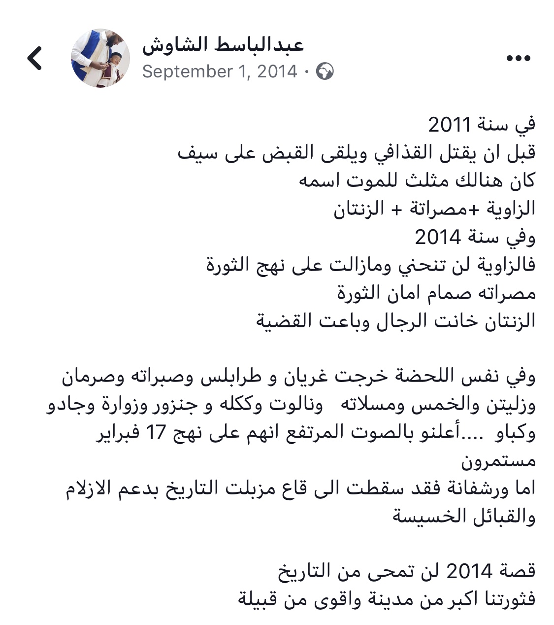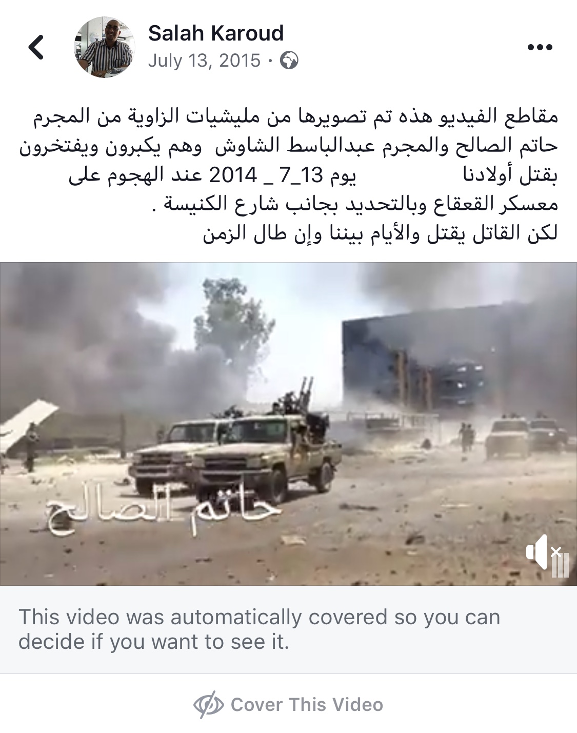 وفي هذه اللقطات ظهر الشاوش وهو يرفع سبابته قائلاً ” فبراير باقية وتتمدد ” مشيراً إلى أنه وآخرين من الزاوية والقوة المتحركة ( مجموعات مسلحة من الأمازيغ ) و ( ثوار جنزور ) يقاتلون ضمن قوات المنطقة العسكرية الغربية التابعة لحكومة الوفاق !.