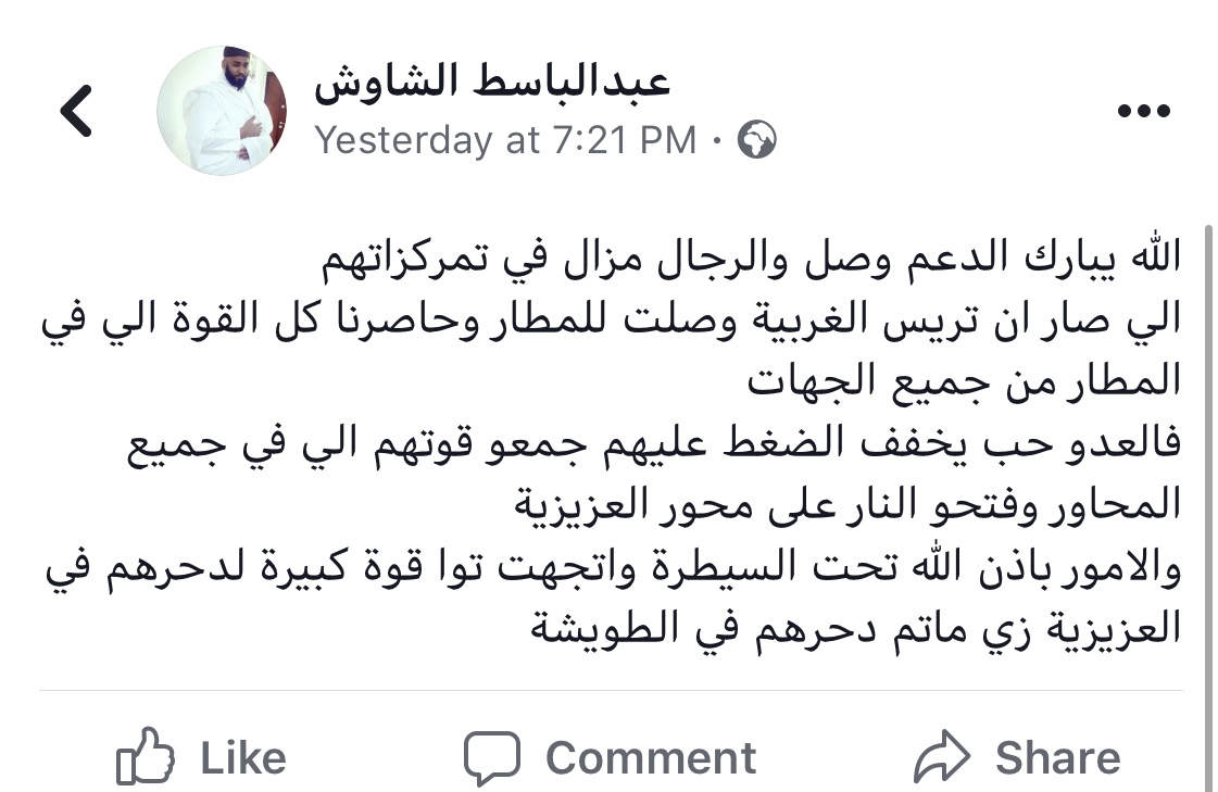 وأكد ” أبو أوس ” بنفسه مشاركته في معارك الخميس جنوب طرابلس وتحديداً على محور مطار طرابلس العالمي مؤكداً بأنه يقاتل ضمن قوات المنطقة العسكرية الغربية بحكومة الوفاق إضافة لمشاركته على محور آخر في العزيزية .