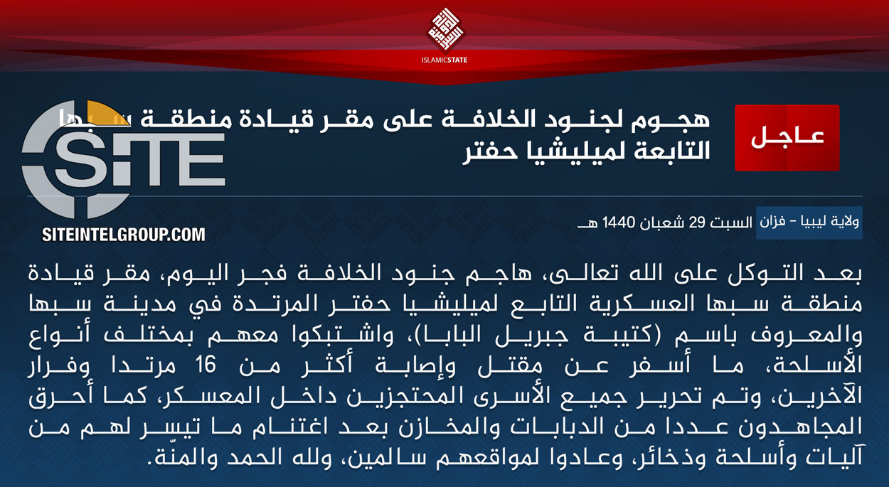 التنظيم المتطرف قال في بيان له إطلعت عليه المرصد بأن من وصفهم بـ”جنود الخلافة” قاموا بهجوم فجر اليوم على مواقع لقيادة القوات المسلحة اللليبية في مدينة سبها وتحديداً كتيبة جبريل البابا ، واصفاً عناصر القوات المسلحة بـ”المرتدين” .