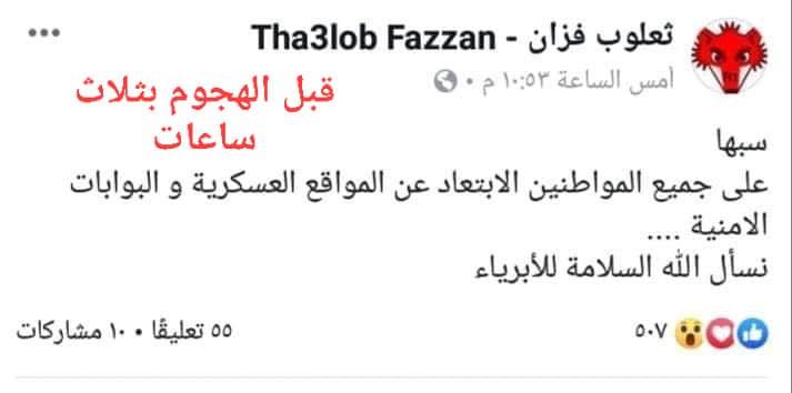 يشار إلى أن عدد من الصفحات الموالية لقوات الوفاق وبعض مقاتليهم في طرابلس قد تبنوا الهجوم الارهابي على مركز تدريب سبها وبعض تلك الصفحات لمحت للهجوم قبل حدوثه بساعات كما هو مبين في الصور المرفقة ، ويأتي هذا الهجوم بعد أن أعطى زعيم تنظيم داعش الارهابي في كلمة مصورة أوامره لمقاتليه الارهابيين باستهداف وحدات الجيش في المنطقة الجنوبية واستنزافهم.