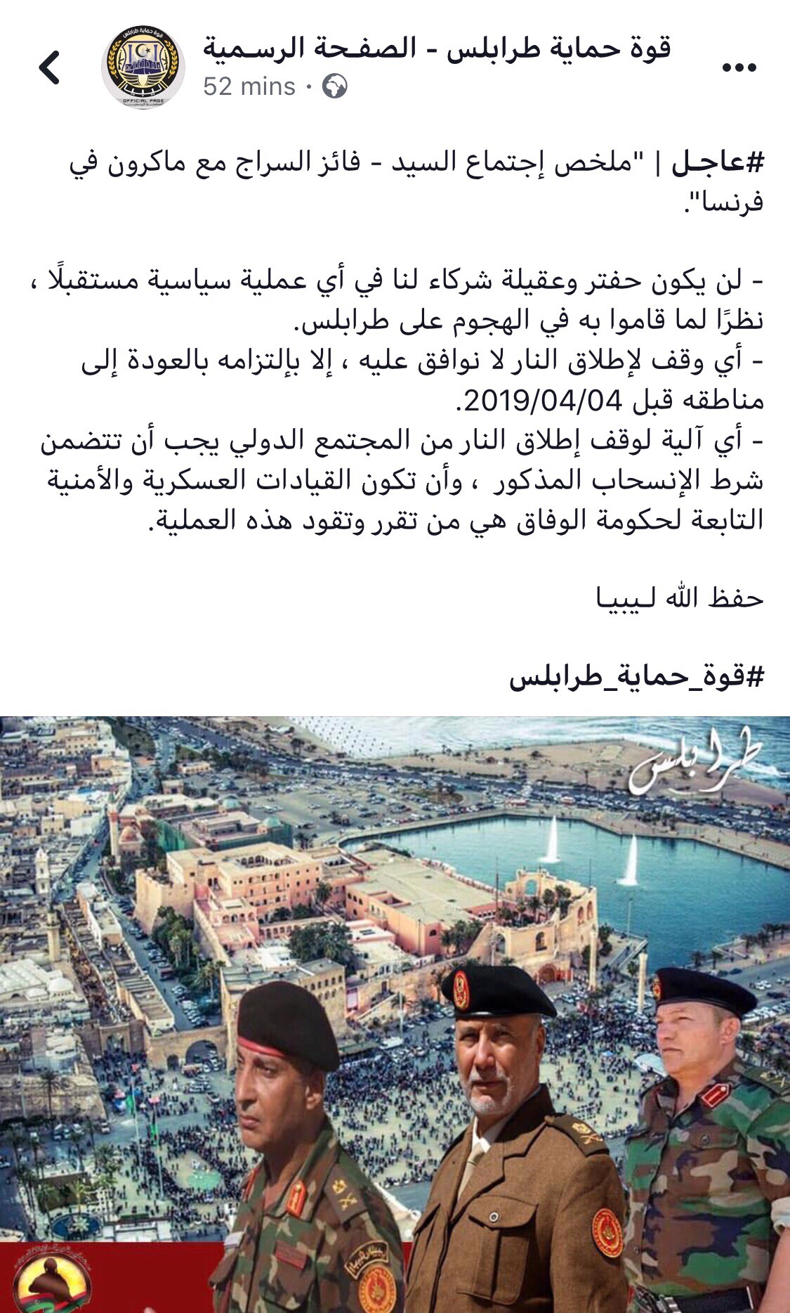 وأضافت القوة بأن السراج أبلغ ماكرون بأن أي وقف لإطلاق النار مع حفتر مرفوض إلا بإلتزامه بالعودة إلى منطاقه ما قبل 2019/04/04 معربة عن تأييدها للسراج وهي المرة الأولى منذ أن إتهمته بالعمالة لجماعة الإخوان المسلمين والعبث بمقدرات الليبيين .