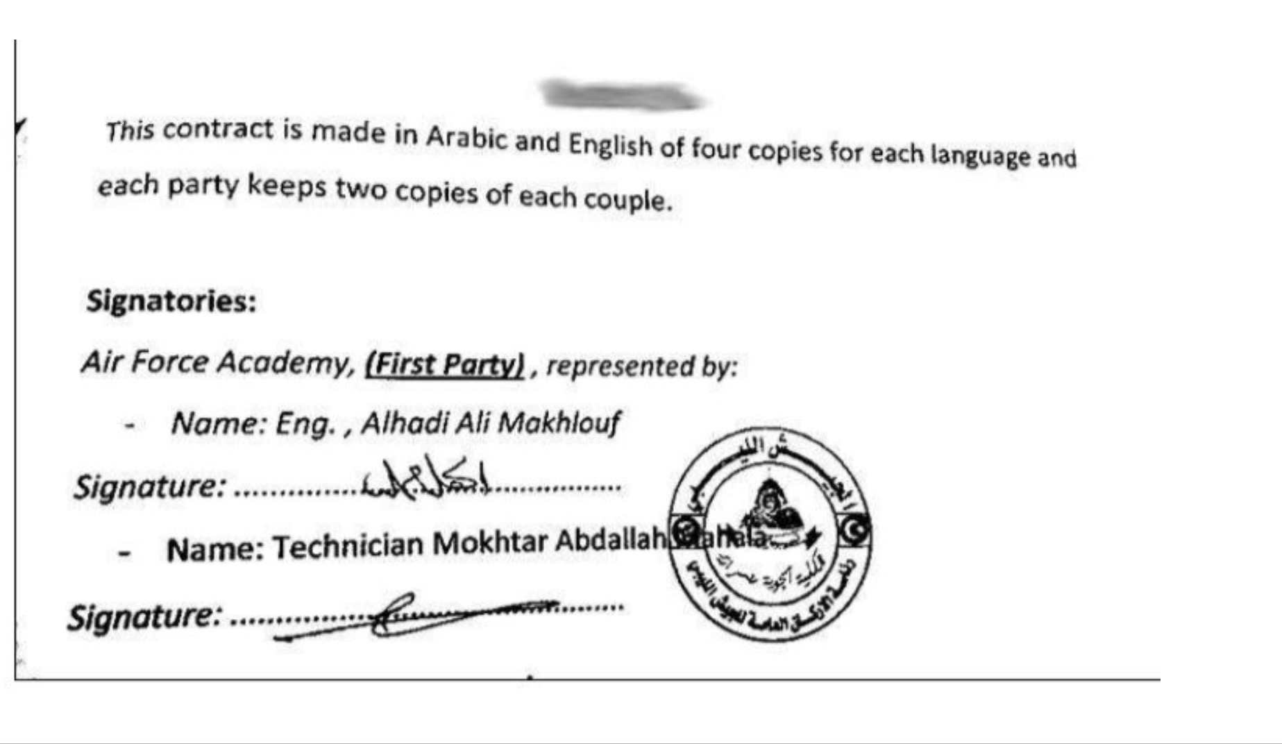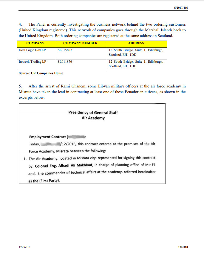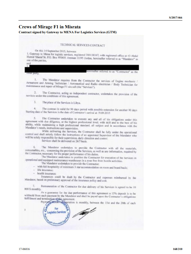 تُظهر هذه الوثائق التي تعود إلى تاريخ ديمسبر 2016 ، عقدًا موقَّعًا بخط يد الهادي مخلوف كممثل للكلية الجوية مع مجموعة مهندسين من دولة الإكوادور عبر عقد من شركة تدعى ” الشرق الأوسط وشمال أفريقيا  للخدمات اللوجستية” والتي اعترفت بدورها للجنة تحقيق أممية بتقديمها بعض الخدمات لحكومة الوفاق الوطني كما أن الوثائق تظهر بأنها مختومة بختم ( الجيش الليبي – الكلية الجوية مصراتة – رئاسة الأركان ). و ” الهادي ” هو ذات الشخص الذي ذكره مرتزق ” ميراج الهيرة ” في إعترافاته المبدئية فور وصوله لغرفة عمليات اللواء عبدالسلام الحاسي في غريان .