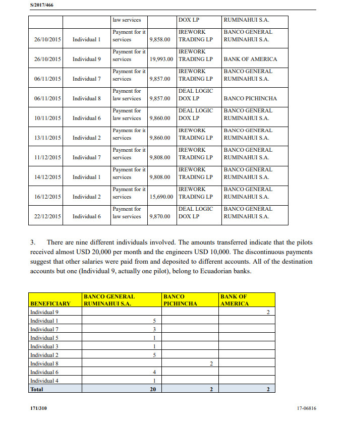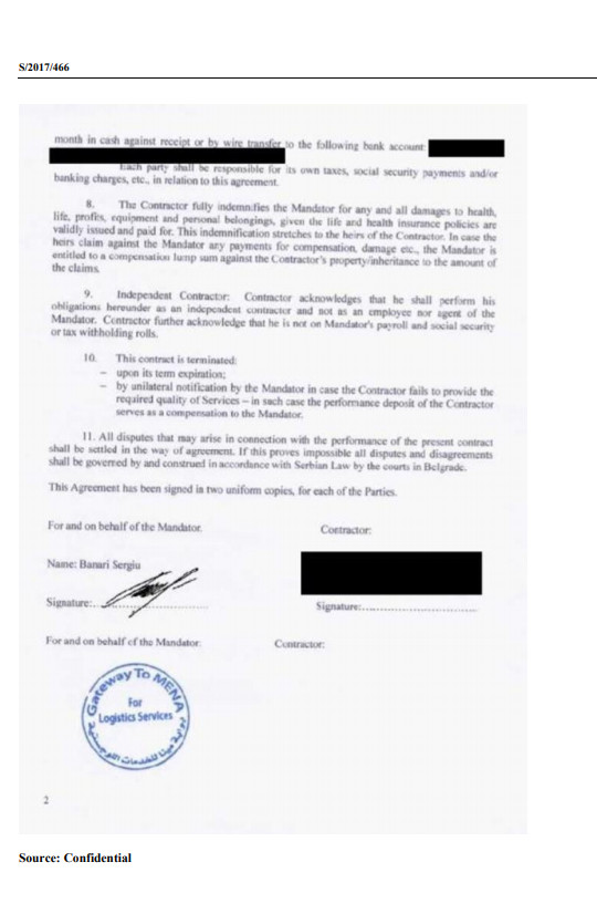 يضيف التقرير مؤكداً بأن تحقيقات أممية جرت بالخصوص أظهرت مدفوعات تترواح ما بين 10 آلاف إلى 20 ألف دولار شهريًا للطيارين المرتزقة مؤكداً  بأن أحدهم من الجنسية البرتغالية كان يقيم في ألمانيا وعمل مع كلية مصراتة ولقي حتفه في 2 يونيو 2016 بعد تحطم طائرته إثر تنفيذه غارة جوية على داعش في سرت كما تتضمن إعترافاً من طيار مرتزق أمريكي يدعى فريدريك شرودر أقر بعمله في مصراتة سنة 2015 في أوج مواجهات فجر ليبيا.