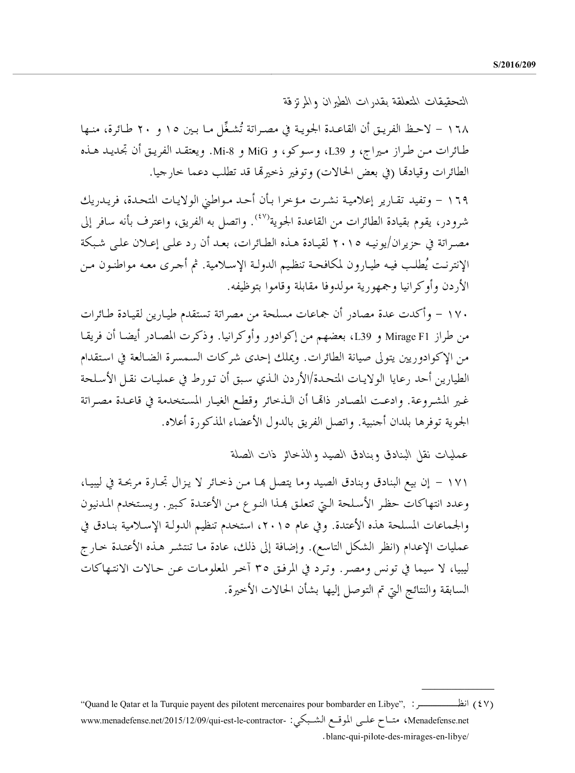 وثيقة تحقيق أممي تؤكد مقتل طيار مرتزق برتغالي خلال طلعة بطائرة ميراج سنة 2016 أثناء حرب البنيان المرصوص كما تشير إلى أن المرتزقة يعملون على طائرتي ميراج إف وان بما يتطابق مع بيانات الجيش عن أن الطائرة التي أسقطها في الجفرة وأنكرها السراج كانت من ذات الطراز