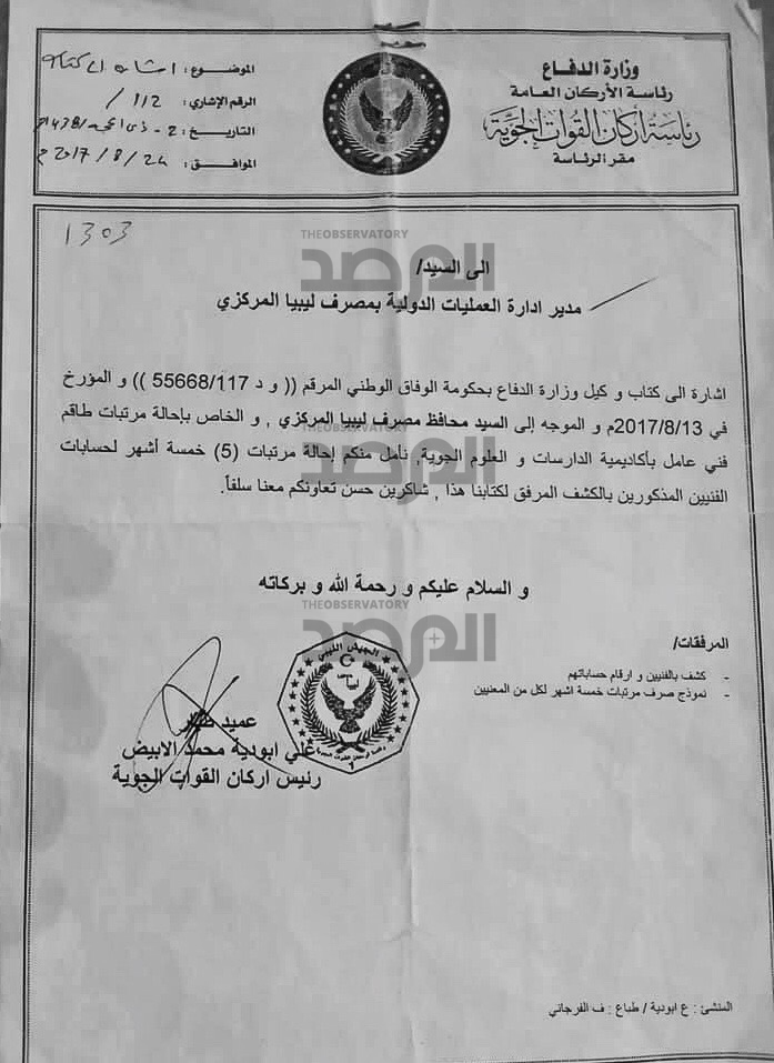 أظهرت وثائق ضويئة تحصلت عليها صحيفة المرصد كشف مرتبات يضم 11 إسم من المرتزقة بينهم فنيون وطياران وكان هذا الكشف موجهاً بتاريخ 24 أغسطس 2017 من عقيد على أبودية الأبيض رئيس الأركان الجوية بحكومة الوفاق إلى مدير إدارة العمليات الدولية بمصرف ليبيا المركزي لغرض السداد بزعم أنهم طاقم فني للتدريب .