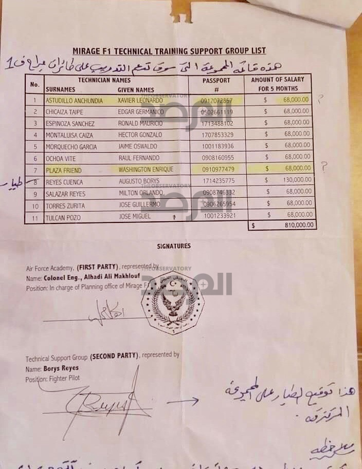 تُظهر هذه الوثائق التي تعود إلى تاريخ ديمسبر 2016 ، عقدًا موقَّعًا بخط يد الهادي مخلوف كممثل للكلية الجوية مع مجموعة مهندسين من دولة الإكوادور عبر عقد من شركة تدعى ” الشرق الأوسط وشمال أفريقيا للخدمات اللوجستية” والتي اعترفت بدورها للجنة تحقيق أممية بتقديمها بعض الخدمات لحكومة الوفاق الوطني كما أن الوثائق تظهر بأنها مختومة بختم ( الجيش الليبي – الكلية الجوية مصراتة – رئاسة الأركان ). و ” الهادي ” هو ذات الشخص الذي ذكره مرتزق ” ميراج الهيرة ” في إعترافاته المبدئية فور وصوله لغرفة عمليات اللواء عبدالسلام الحاسي في غريان .
