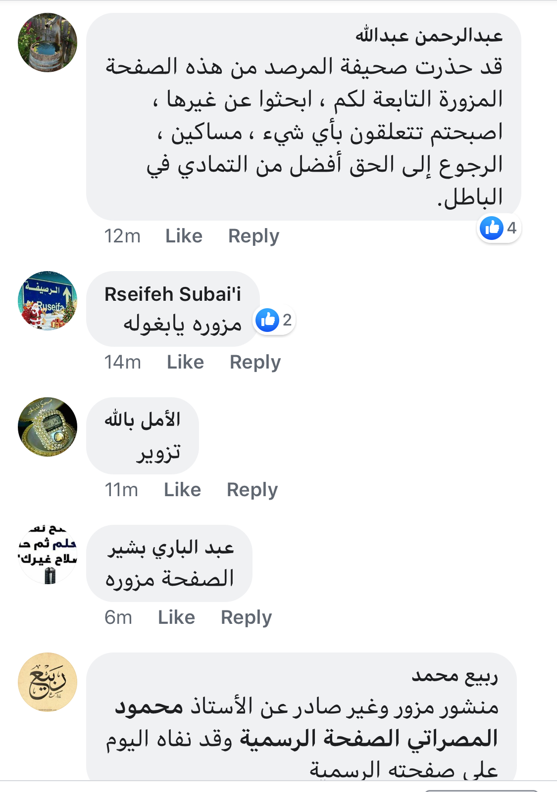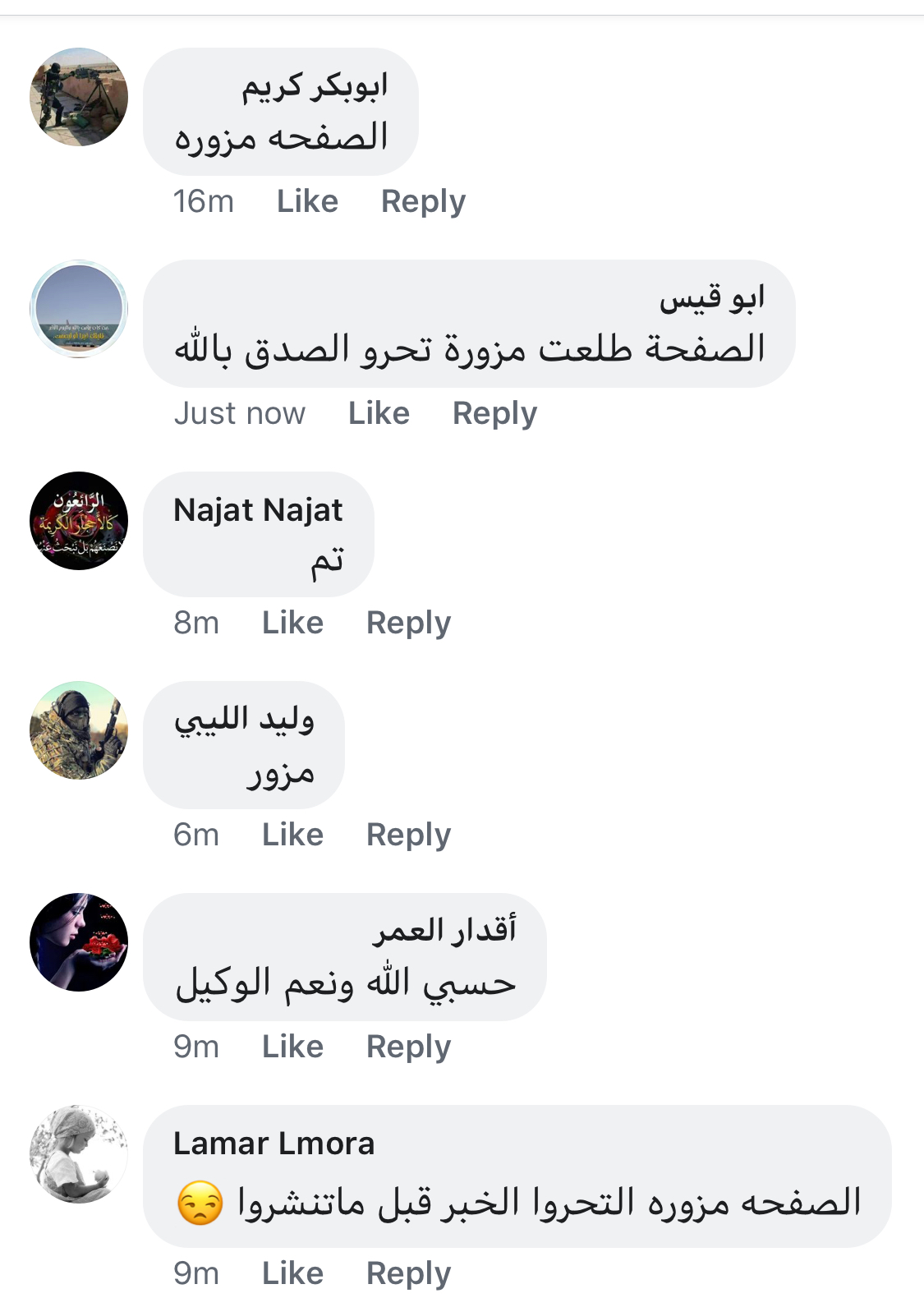 ويأتي هذا العمل بالرغم من أن الصحيفة كانت قد نبّهت منذ ظهر اليوم الخميس بأن المنشور المشار له مفبرك ولا أساس له الأمر الذي يضع علامة إستفهام حول الإصرار على ترويجه والترويج للصفحة المزورة يضاف إلى ذلك أن عشرات المعلقين كما هو مُبين بالصور أدناه ( إنظر للأسفل ) قد نبهوا القوة إلى أن المنشور مزور إلى أنها أصرت على عدم التراجع عنه بالحذف .