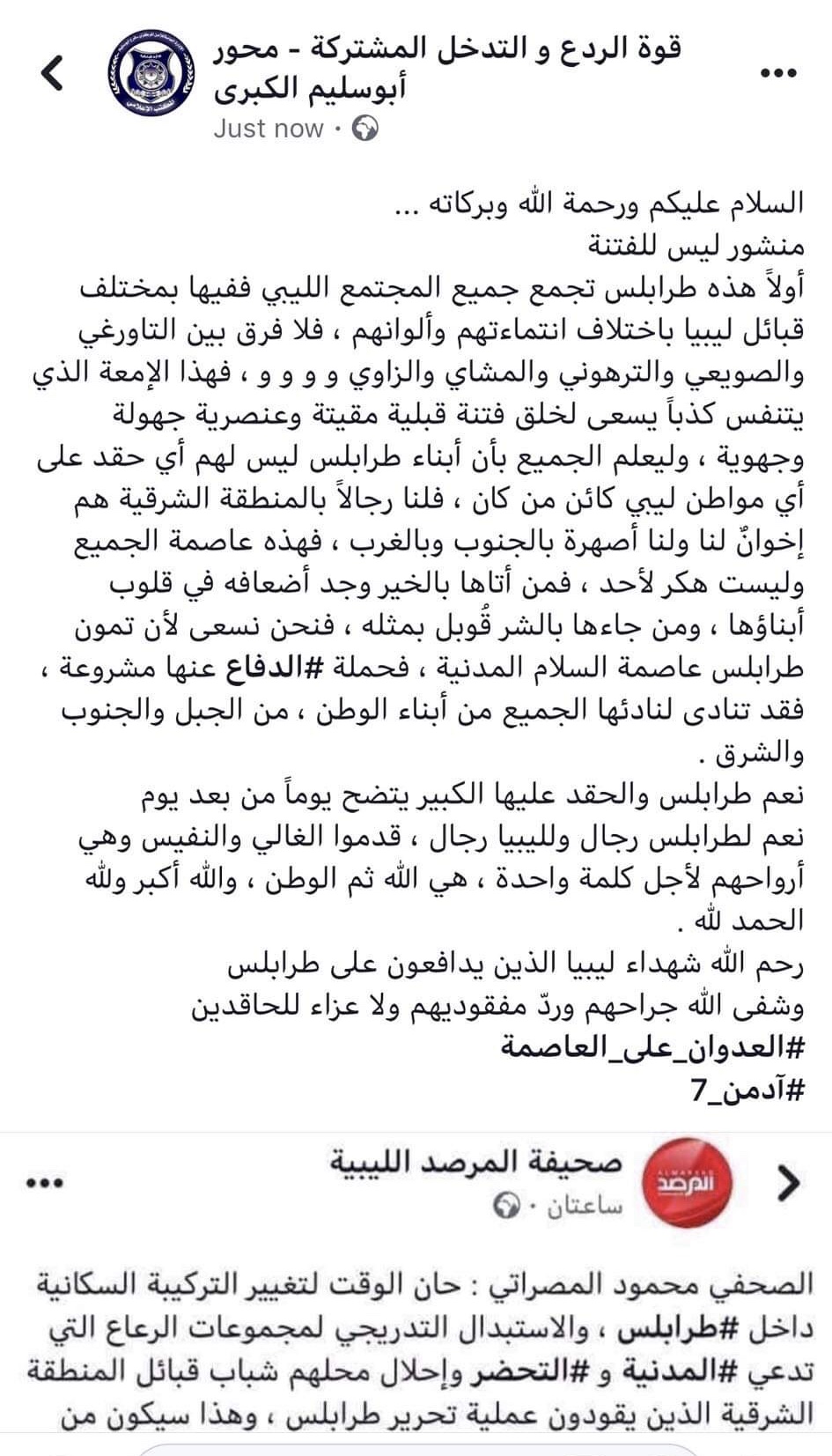 تنفي صحيفة المرصد مجدداً صحة المنشور الذي نشرته هذه القوة التابعة للداخلية والمسيطرة على كامل منطقة أبوسليم وتحملها ورئيسها المباشر ، وزير الداخلية بحكومة الوفاق ، عضو مجلس النواب المنقطع فتحي على باشاغا المسؤولية التامة عن هذا التلفيق والتدليس والتحريض على الصحيفة بهدف الإضرار بسمعتها وتضليل القراء لإبعادهم عن منصاتها الحقيقية وجذبهم نحو صفحة مزورة لتحقيق هدف ما وذلك إنطلاقاً من مسؤولية الرئيس على مرؤوسيه .