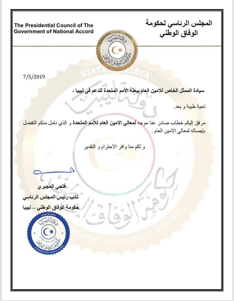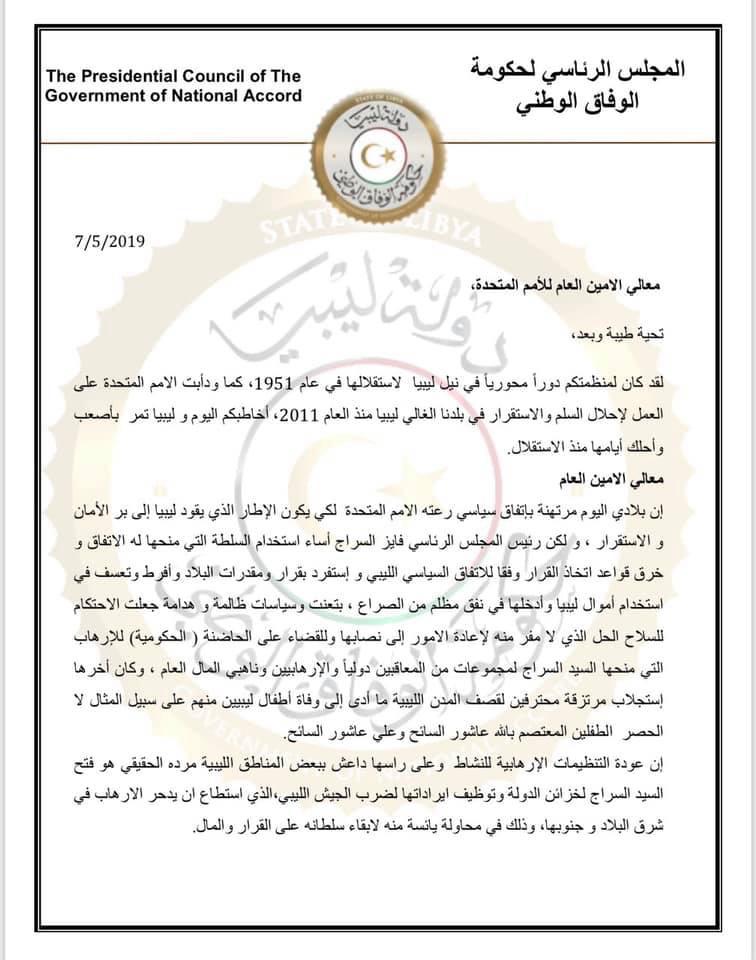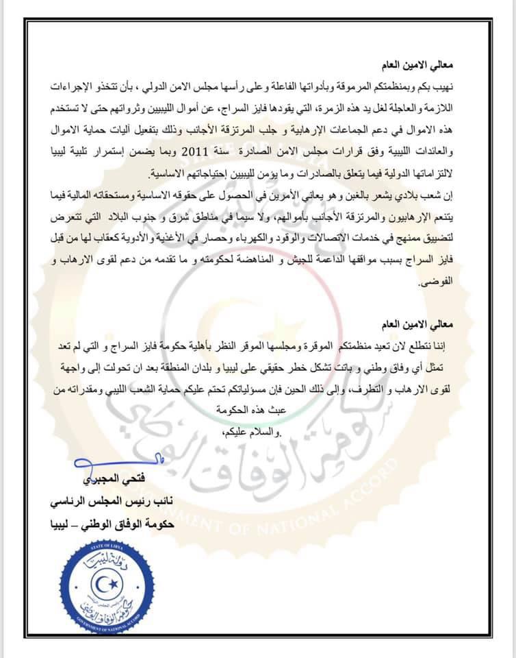 إننا نتطلع لان تعيد منظمتكم الموقرة ومجلسها الموقر النظر بأهلية حكومة فايز السراج و التي لم تعد تمثل أي وفاق وطني و باتت تشكل خطر حقيقي على ليبيا و بلدان المنطقة بعد ان تحولت إلى واجهة لقوى الارهاب و التطرف، وإلى ذلك الحين فإن مسؤلياتكم تحتم عليكم حماية الشعب الليبي ومقدراته من عبث هذه الحكومة.