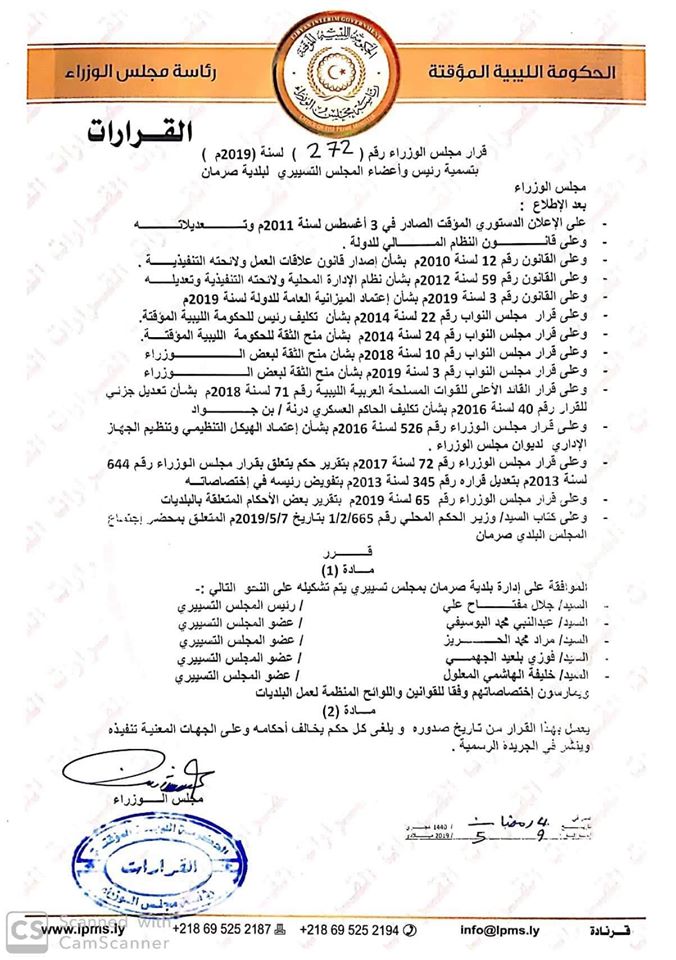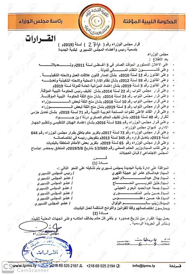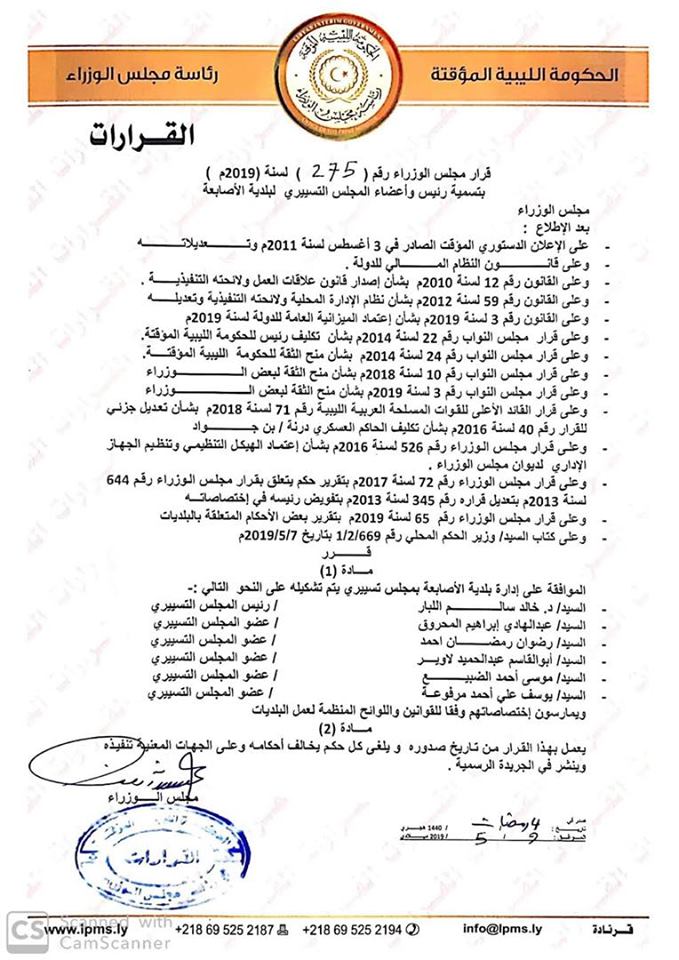 ليبيا – أصدر مجلس وزراء الحكومة المؤقتة أربعة قرارات بشأن تسمية رؤساء وأعضاء المجالس التسييرية لبلديات الأصابعة والجديدة والعجيلات وصرمان.