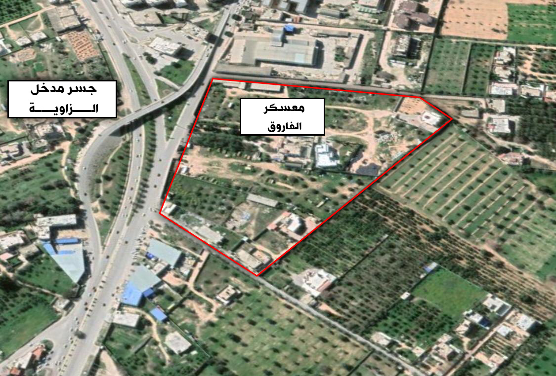 وأظهرت هذه الصور الملتقطة حديثاً والتي تحصلت عليها صحيفة المرصد وتنشرها بعد مطابقة دقيقة ، عدداً من المدرعات والدبابات في معسكر كتيبة الفاروق الواقع في المدخل الشرقي لمدينة الزاوية أسفل الجسر على المفترق المؤدي إلى وسط المدينة مع الطريق الساحلي .