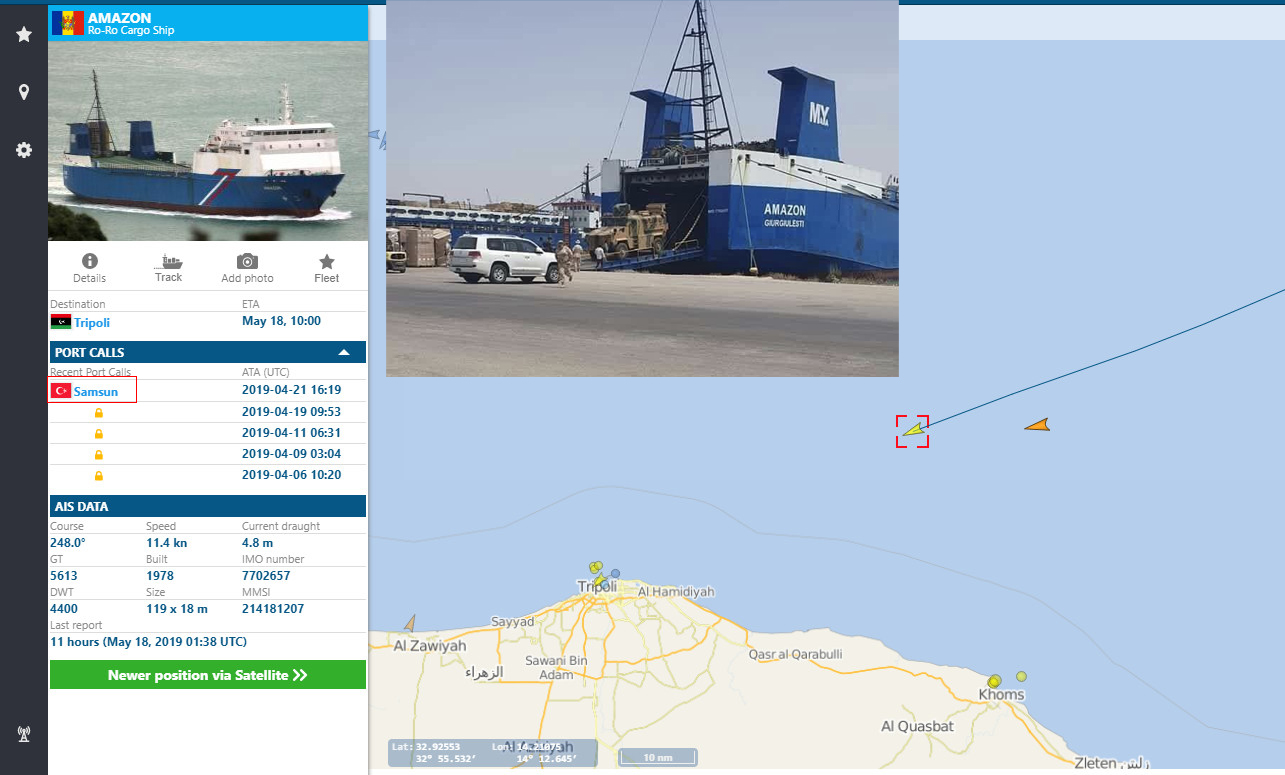 وبالبحث عن السفينة عبر تطبيق متابعة السفن تبين بأنها تحمل إسم أمازون وقد أبحرت في 21 أبريل الجاري من ميناء ” سامسون التركي ” شمال تركيا وقد تطابق الإسم الظاهر عليها مع بياناتها عند الرسو قبالة ميناء طرابلس ونقطة إبحارها .