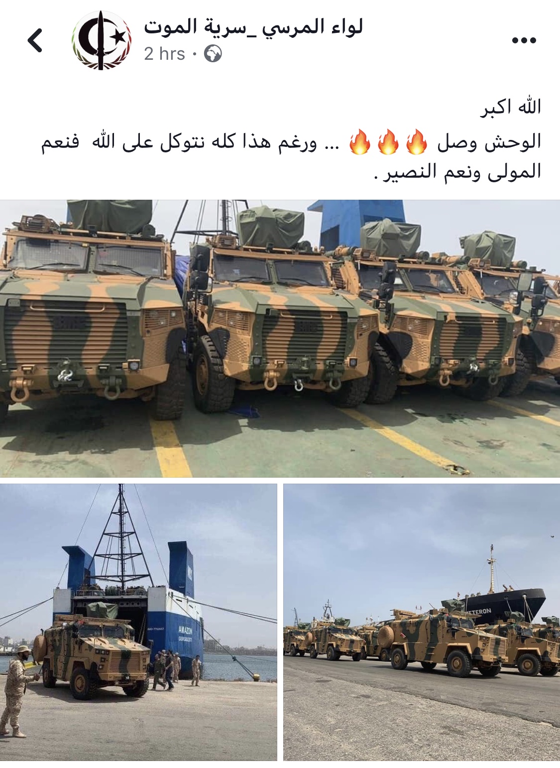 ليبيا – تسلم لواء الصمود بقيادة المعاقب دولياً وأمريكياً صلاح بادي حصته من المدرعات والأسلحة التركية التي وصلت ظهر السبت إلى ميناء طرابلس قادمة من ميناء ” سامسون ” التركي وذلك بالرغم من عدم وجود أي تبعية مالية أو إدارية له مع حكومة الوفاق وفقاً لما هو معلنٌ على الأقل .