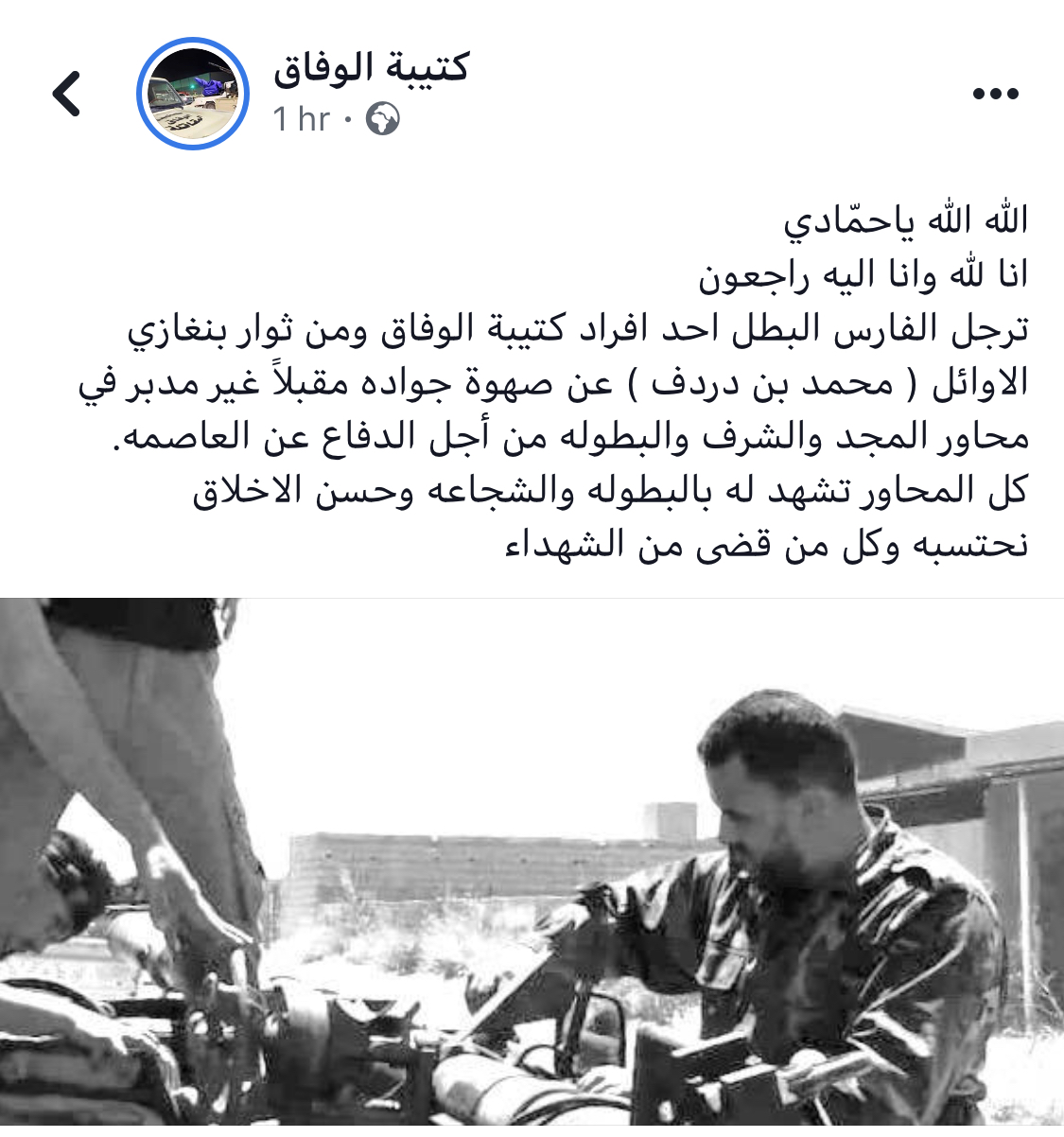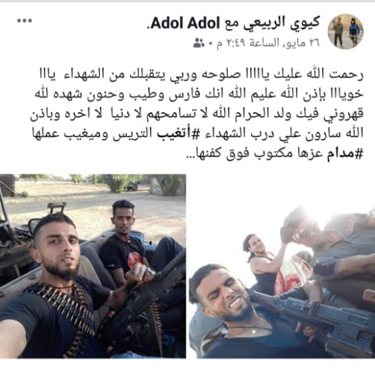 وفي الصور التي نشرها الربيعي عبر حسابه الشخصي لمشاركته بمعارك طرابلس ، ظهر أشخاص آخرون من مصراتة على متن سيارات بدون غطاء تابعة لكتيبة ” المحارب ” التابعة للواء الصمود بقيادة صلاح بادي والذي يقاتل في طرابلس تحت راية حكومة الوفاق .