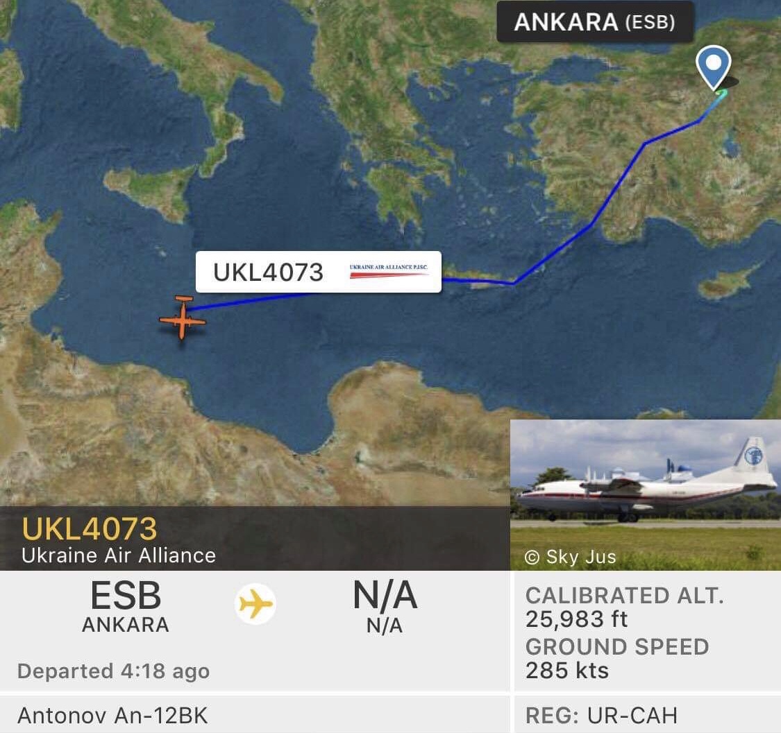 البداية مع الطائرة ” أنتينوف 12 بي كي ” ذات رمز التسجيل ” UR-CAH ” التي يبدوا من بيانتها التي رصدتها المرصد بأنها كانت متوقفة عن الخدمة منذ شهر ديسمبر الماضي ثم عادت للعمل مطلع مايو المنصرم وكانت أول رحلاتها خارج أوكرانيا إلى مصراتة إنطلاقا من مطار أنقرة يوم 1 يونيو الجاري وحملت الرحلة رقم ( UKL4073 ) قبل أن تسير رحلة أخرى أيضاً بذات الرقم إلى مصراتة اليوم الإثنين 3 يونيو  ومنها غادرت مساءً إلى مطار المنستير في تونس .