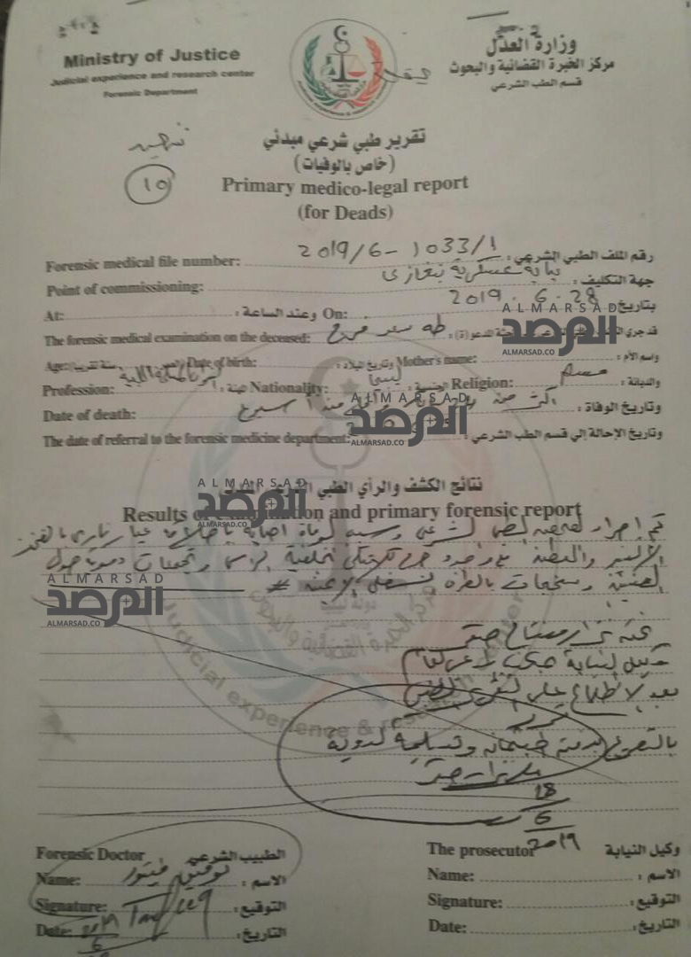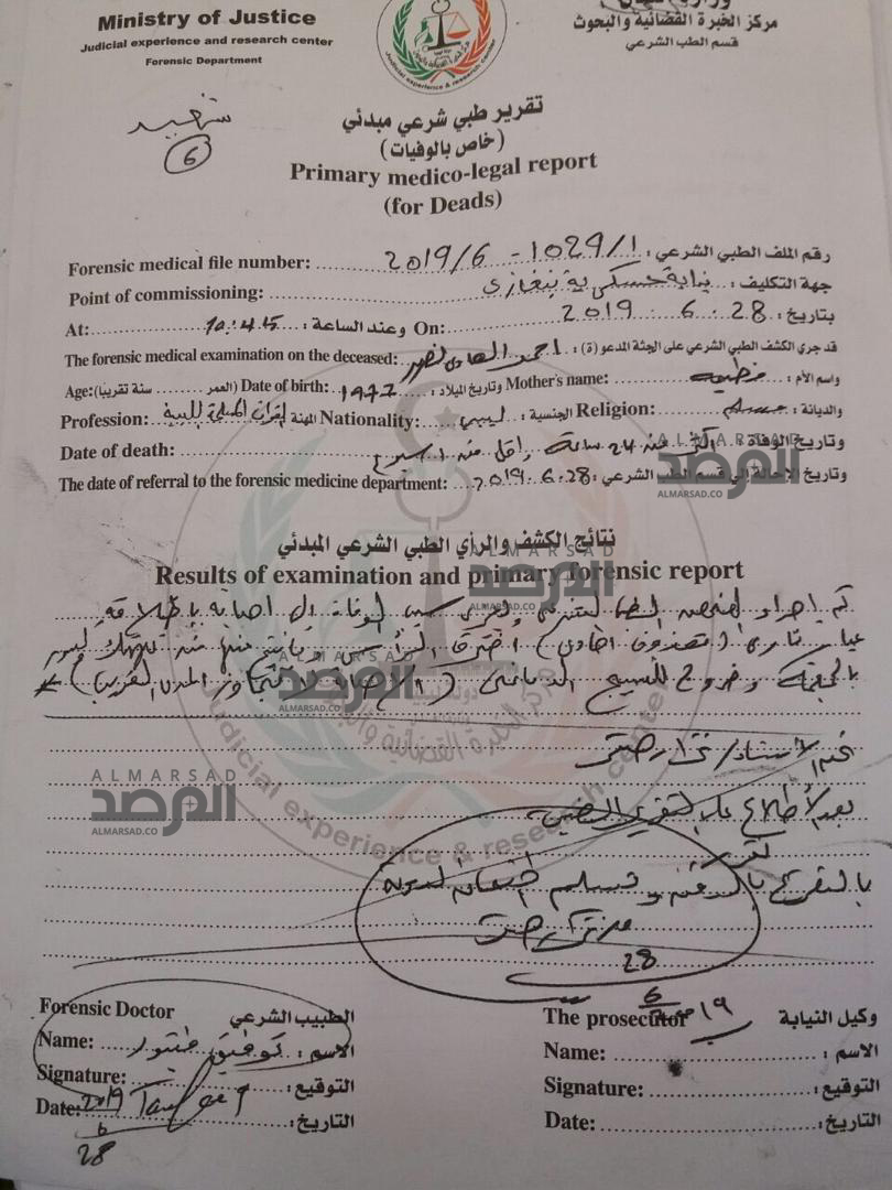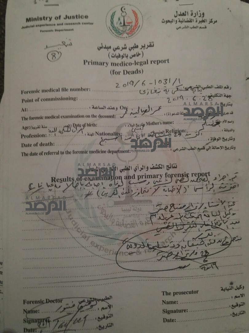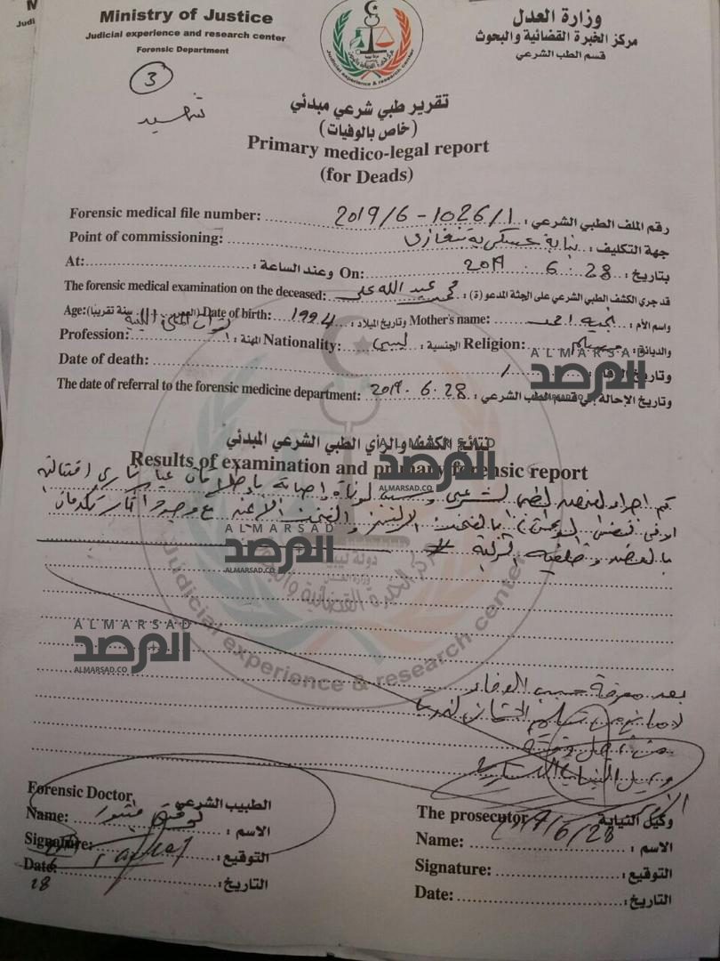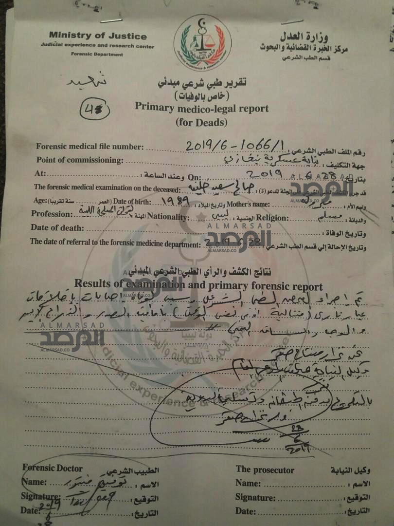 في شهادات تحصلت صحيفة المرصد على نسخة عنها بعد تصريح وكيل النيابة بالدفن ، توصل الطب الشرعي إلى تعرض عدد من العناصر إلى التصفية بالفعل وقد تأكد الأطباء بأن الضحايا تعرضوا لرماية بالرصاص من خلف الرأس وخرجت من الأمام كما تأكد من أن آخرين أصيبوا بأعيرة نارية متتالية ومن مسافات قريبة ما يعني تعرضهم لعملية إعدام ميداني .