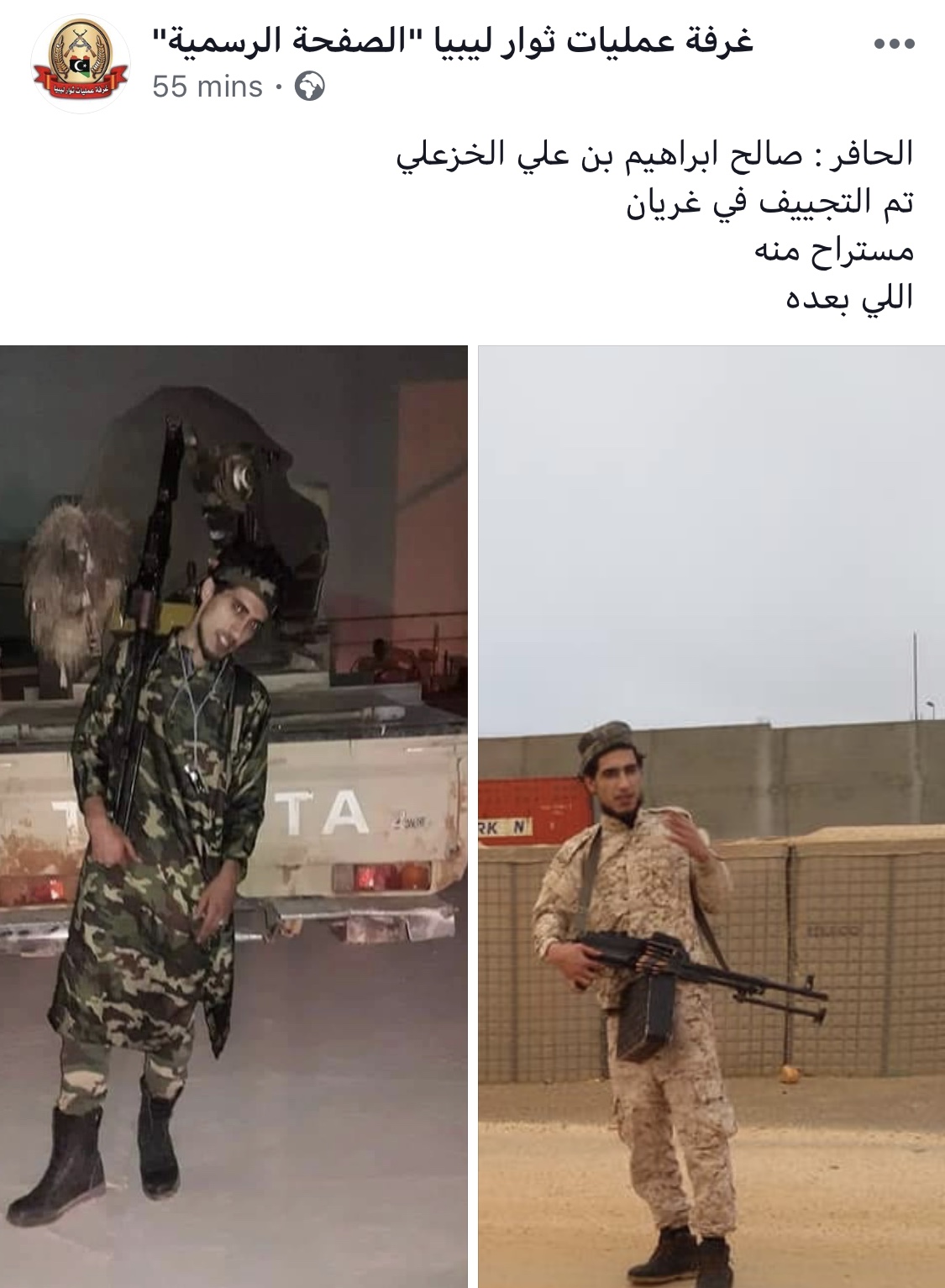 ومن جانبها أكدت عائلة الجندي المغدور صالح إبراهيم بن علي الخزعلي في مدينة البيضاء تلقيهم جثمانه من مستشفى غريان وهو قتيل بعد خروجه في مقطع وهو مصاب بجروح طفيفة بذات المستشفى متحدثاً بكامل قواه العقلية قبل أن تتم تصفيته فيما حملت الأسرة ” اللواء ” أسامة جويلي آمر المنطقة الغربية العسكرية بالوفاق مسؤولية المجزرة وذلك من خلال تسجيل فيديو تحدث فيه ولي أمر الضحية من مأتم العزاء عقب دفنه يوم أمس السبت .