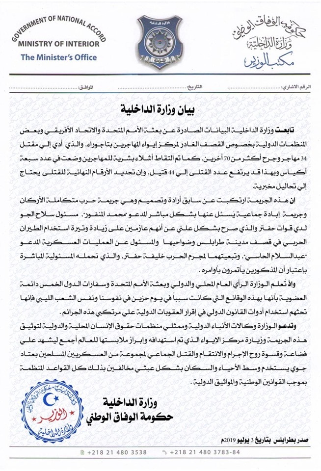 يشار إلى أن غرفة عمليات سلاح الجو بالقيادة العامة للقوات المسلحة قد ردت في بيان لها أمس الاربعاء على الاتهامات التي وجهت لها بشأن إستهداف مركز إيواء المهاجرين في تاجوراء ، مؤكدةً على أنها لم تستهدف مركز الإيواء المذكور على الإطلاق ولم يكن ضمن قائمة بنك الأهداف بتاتاً ولم تصوب صوبه أي سلاح.