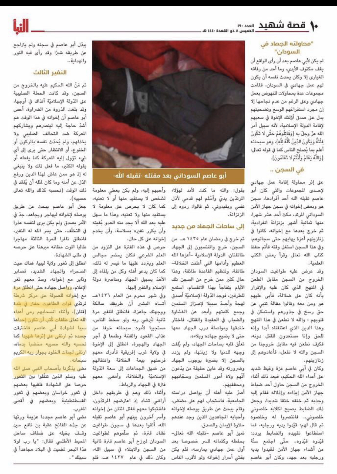 قضى ” أبوعاصم ” فترة سجن أخرى بسجون نظام البشير ومن ثم أطلقت السلطات سراحه مرة أخرى في سلوك يبرر دعم هذا النظام المنهار المتحالف مع أنقرة والدوحة للمتطرفين ومن الخرطوم إنطلق مجدداً لدعم تنظيم داعش بما يعرف بسرايا الصحراء في ولاية ليبيا .