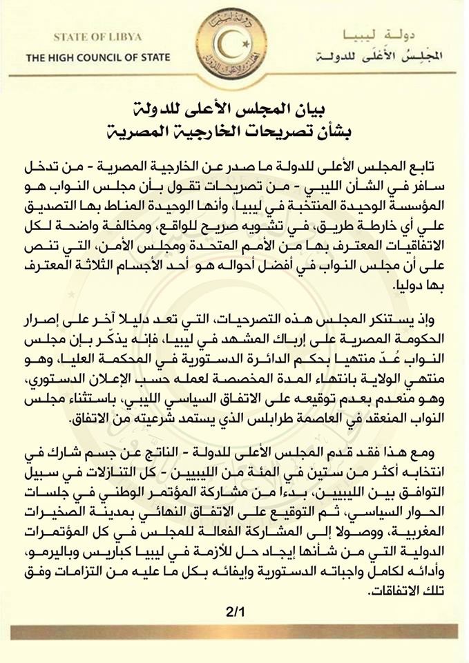 وإستنكر المجلس في بيان تأكيد البيان المصري على أن مجلس النواب هو المؤسسة الوحيدة المنتخبة في ليبيا، وأنها الوحيدة المناط بها التصديق علي أي خارطة طريق .