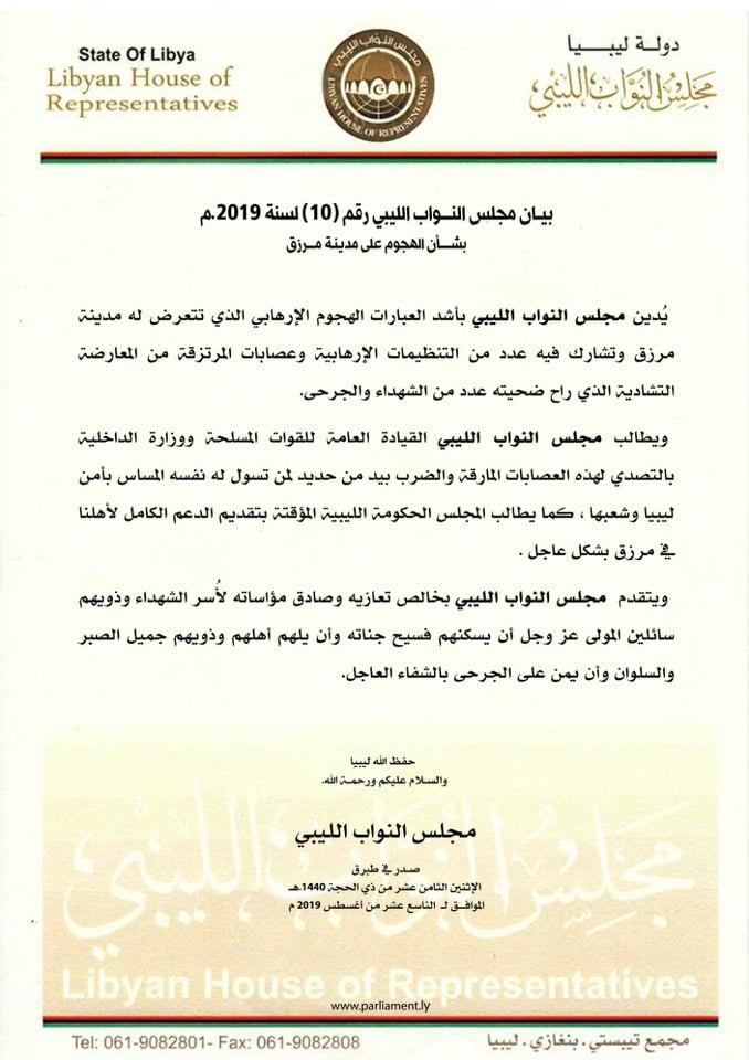 كما طالب البرلمان في بيانه الحكومة المؤقتة بتقديم الدعم الكامل لأهالي مرزق بشكل عاجل ، مقدماً خالص تعازيه لاسر ضحايا هذا الهجوم .