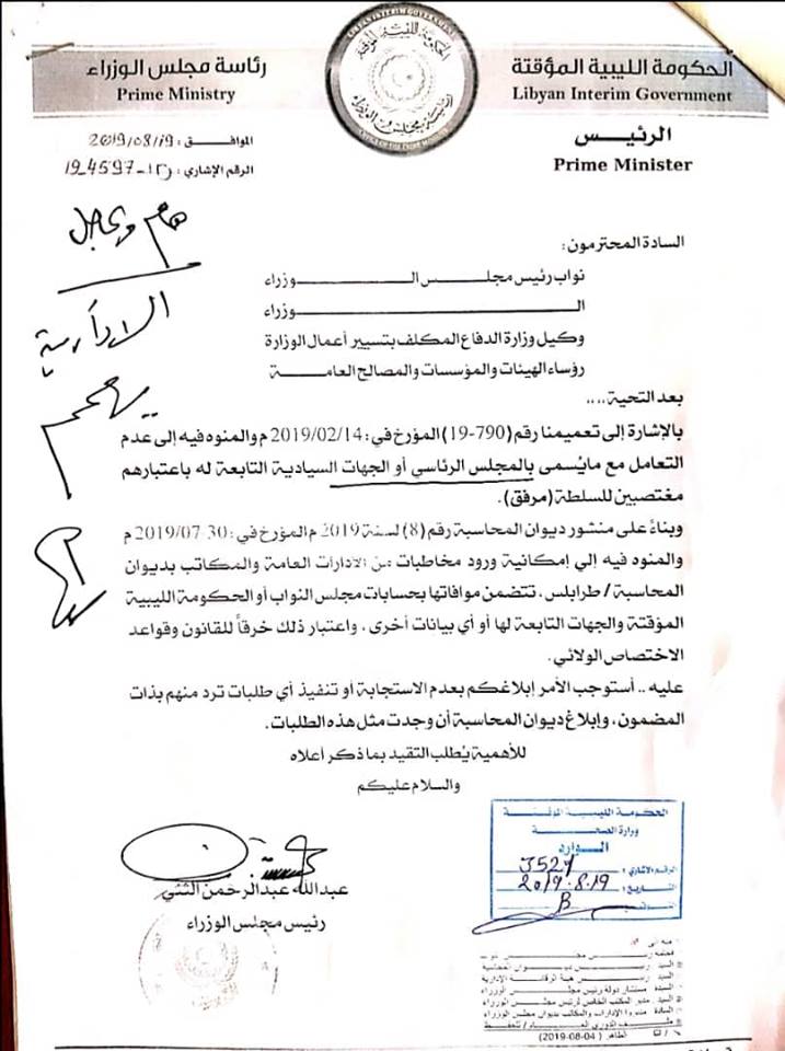 ونشرت الوزارة خطاب الثني الموجه إلى كل من الوزراء ووكيل الوزارة المكلف بتسير أعمال الوزارة ورؤساء الهيئات و المؤسسات و المصالح العامة بعدم التعامل مع الرئاسي وفقاً لما جاء في منشور ديوان المحاسبة رقم 8 لعام 2019 و المؤرخ بتاريخ الـ7من شهر يوليو للعام الجاري و المنوه فيه إلى إمكانية ورود مخاطبات من الإدارات العامة والمكاتب بديوان المحاسبة – طرابلس تتضمن موافاتها بحسابات مجلس النواب أو الحكومة المؤقتة والجهات التابعة لها أو أي بيانات أخرى وإعتبار ذلك خرقا للقانون وقواعد الإختصاص الولائي .