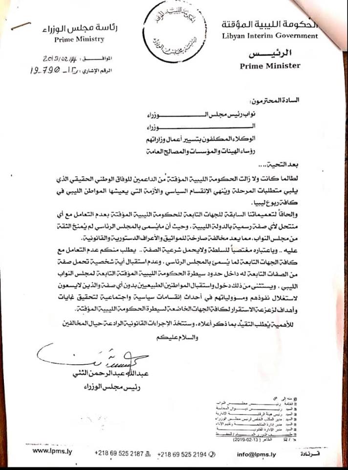 هذا وطالب الثني في خطاب موجه إلى كل من نواب رئيس مجلس الوزراء و الوزراء والوكلاء المكلفون بتسيير أعمال وزاراتهم ورؤساء الهيئات والمؤسسات والمصالح العامة إلى عدم التعامل مع أي منتحل لأي صفة رسمية بالدولة الليبية وحيث أن ما يسمى بالمجلس الرئاسي لم يمنح الثقة من مجلس النواب مما يعد مخالفاتة صارخة للمواثيق و الأعراف الدستورية و القانونية.