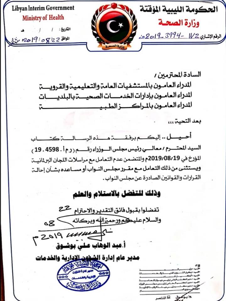 صحة المؤقتة وجهت خطابها والذي تلقت المرصد نسخة منه إلى كل من من المدراء العاملون بالمستشفيات العامة والتعليمية والقروية والمدراء العاملون بإدارات الخدمات الصحية بالبلديات والمدراء العامون بالمراكز الطبية.