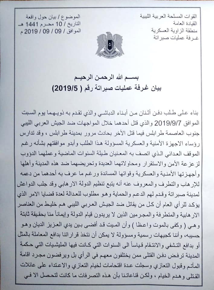وإعتبر البيان أن تسجيل مشاركة الفيتوري الدباشي في القتال رغم ثبوت إنتسابه لداعش ومشاركته في جلب العناصر الداعشية إلى طرابلس يثبت بأن من تقاتلهم القوات المسلحة هناك هم ثلة مو الارهابيين والمتطرفين والمجرمين .