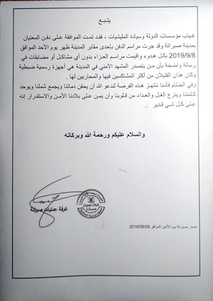 وقالت الغرفة في بيان بأنها سمحت لعائلة القتيل بدفن جثمانه وإقامة مراسم عزاء في المدينة له ولعمه الذي لقي مصرعه هو الآخر في حادث سير بذات اليوم الذي قتل فيه الفيتوري الدباشي وذلك إنطلاقاً من مبادئ إنسانية وشرعية سامية .