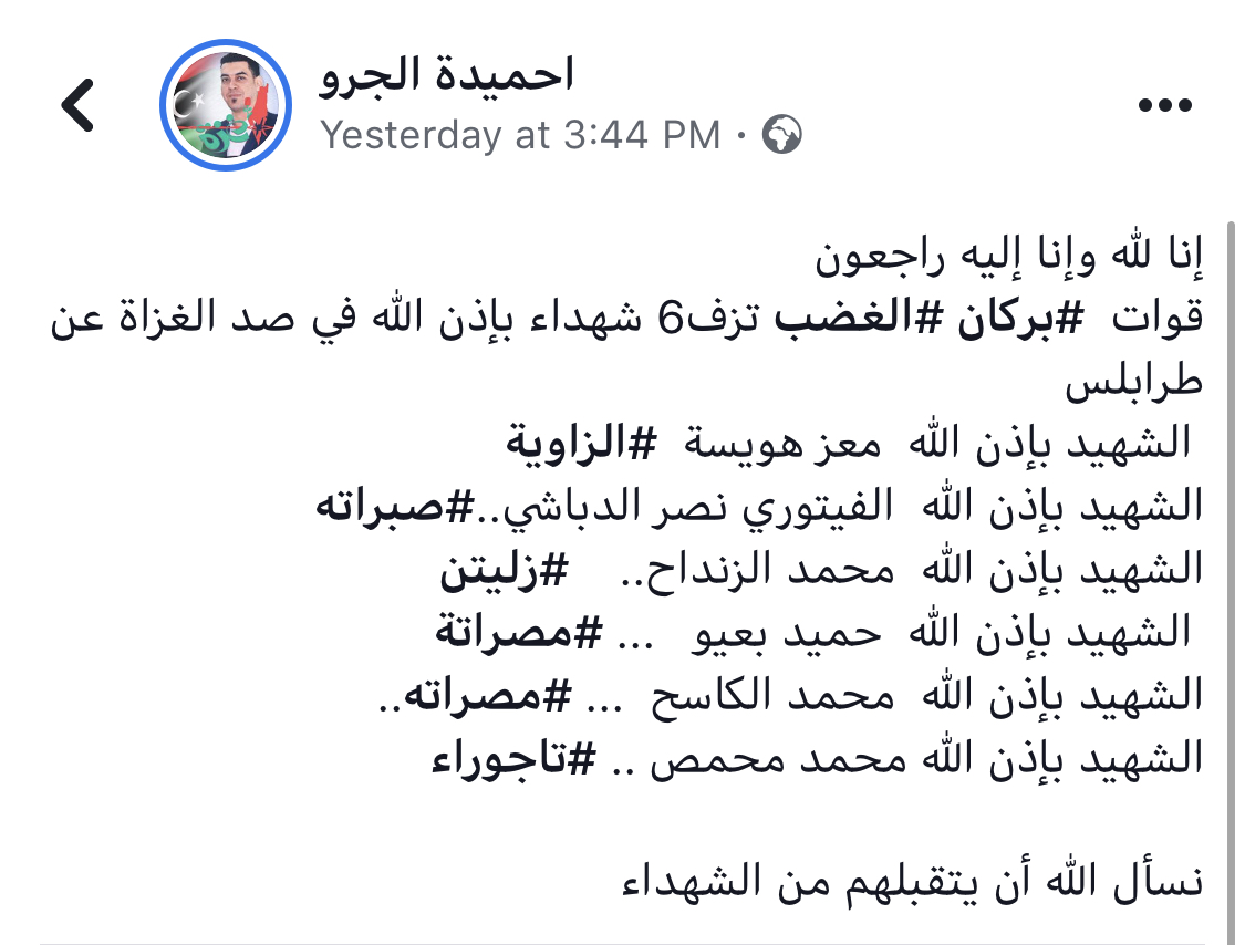 وفي السياق ذاته أكدت مصادر غرفة عمليات مدينة صبراتة بأن القتيل وهو ( الفيتوري نصر امحمد الدباشي ) وقد قُتل في محور عين زارة وهو من مواليد 1988 ومن سكان ذات المدينة التي فر منها قبل سنتين ومن ثم إعتقاله وقد نعاه عدد من المدونين الموالين لحكومة الوفاق مؤكدين بأنه كان منضوياً تحت قوات ” المنطقة العسكرية الغربية ” بالوفاق ، وتحديداً كتيبة شهداء صبراتة المتشددة الفارة الى الزاوية .