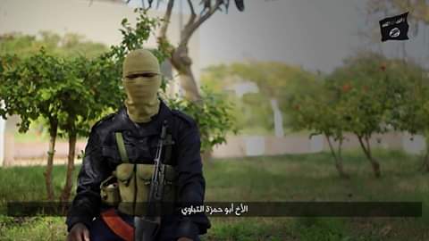 وأضاف بأن ” أبوحمزة التباوي ” هو احد العناصر القيادية الفارة من مدينة سرت التي كان آخر ظهور له فيها شهر سبتمبر 2015 عندما ظهر في إصدار مرئي بثه التنظيم تحت عنوان ” رسالة إلى أخوة التوحيد 2 ” حث خلاله التبو على دعم داعش ضمن مجموعة رسائل بثها في تلك الفترة في إطار سياسة البروبغندا التي كان يتبعها إبان سيطرته على المدينة ومناطق في بنغازي وقد توعد فيه المشير حفتر بالقتال والمفخخات والعمليات الإنتحارية واصفاً إياه بـ ” الطاغوت ” .