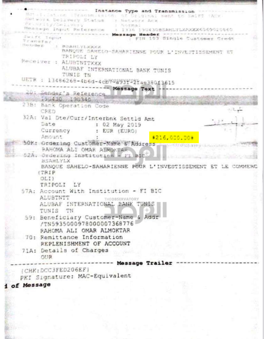 كما تبين أيضاً وفقاً لـ” سويفت ” آخر تحصلت عليه المرصد تحويل كافة مبالغ مكافأة نهاية الخدمة لرئيس مجلس الإدارة بحسابه في تونس يوم 2 مايو الماضي تحسباً لإقالته أو تقاعده من المصرف مخالفاً لنص المواد المقررة بلائحة شؤون العاملين بالمصرف وقد بلغت فيمتها الإجمالية 216 ألف يورو سبقه تحويلات أخرى يرجح بأنها لذات الغرض كانت بقيمة 70 ألف يورو ثم 20 ألف يورو !.