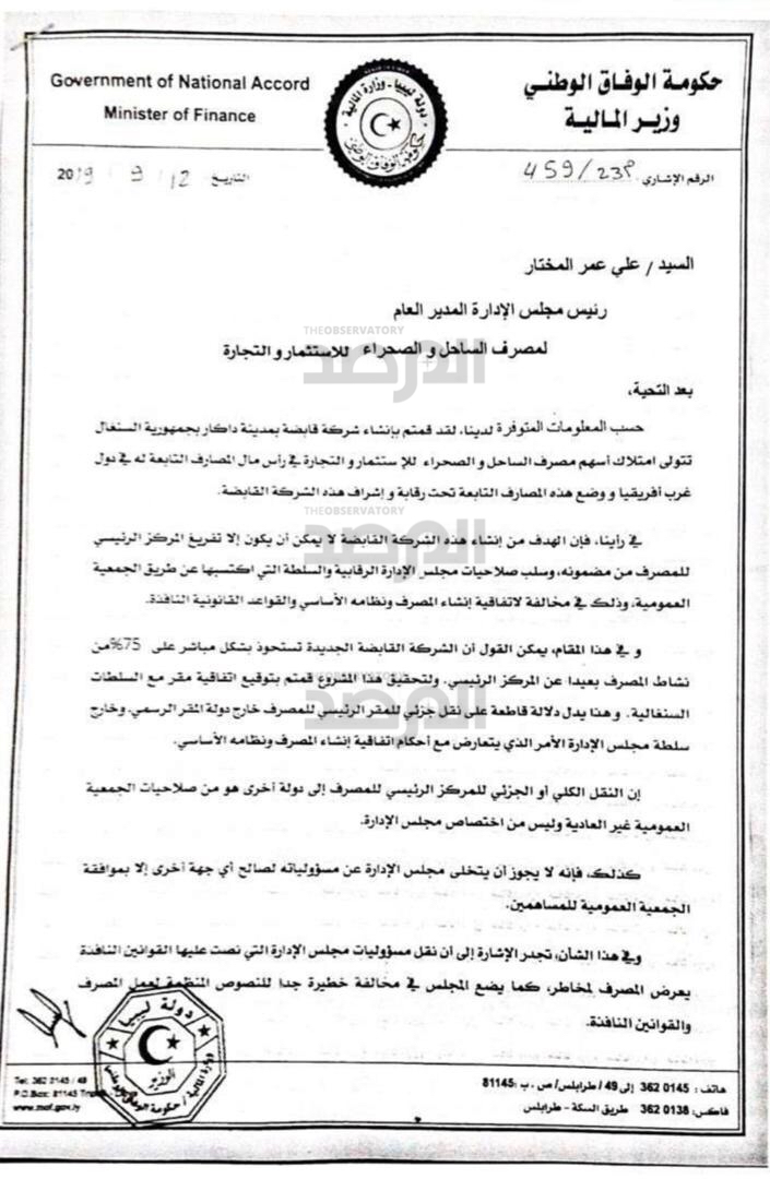 وقد تحصلت صحيفة المرصد على نسخة من رسالة وزير المالية بحكومة الوفاق فرج بومطاري بتاريخ 12/09/2019 رقم إشاري م 459/23) موجهة إلى رئيس المصرف علي عمر المختار حيث تشير إلى خطورة هذا الإجراء ورغم ذلك قام مدير المصرف بنقل وظيفة مساعد المدير العام وصلاحياته من المقر الرئيسي طرابلس إلى تونس .