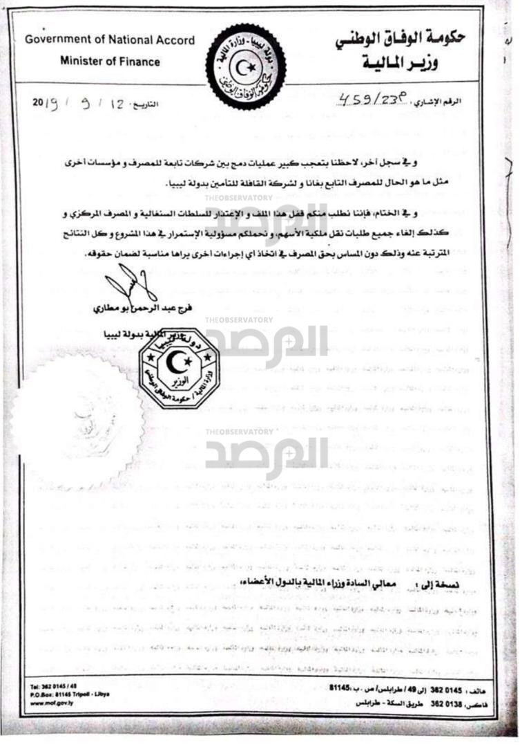 وقد تحصلت صحيفة المرصد على نسخة من رسالة وزير المالية بحكومة الوفاق فرج بومطاري بتاريخ 12/09/2019 رقم إشاري م 459/23) موجهة إلى رئيس المصرف علي عمر المختار حيث تشير إلى خطورة هذا الإجراء ورغم ذلك قام مدير المصرف بنقل وظيفة مساعد المدير العام وصلاحياته من المقر الرئيسي طرابلس إلى تونس .