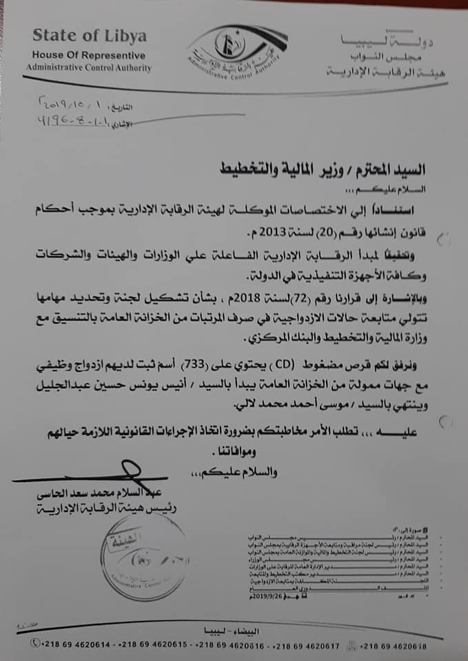 وأشارت الهيئة في خطابها إلى قراراها رقم 72 لعام 2018 بشأن تشكيل لجنة وتحديد مهامها تتولى متابعة حالة الإزدواجية في صرف المرتبات من الخزانة العامة بالتنسيق مع وزارة المالية والبنك االمركزي البيضاء.